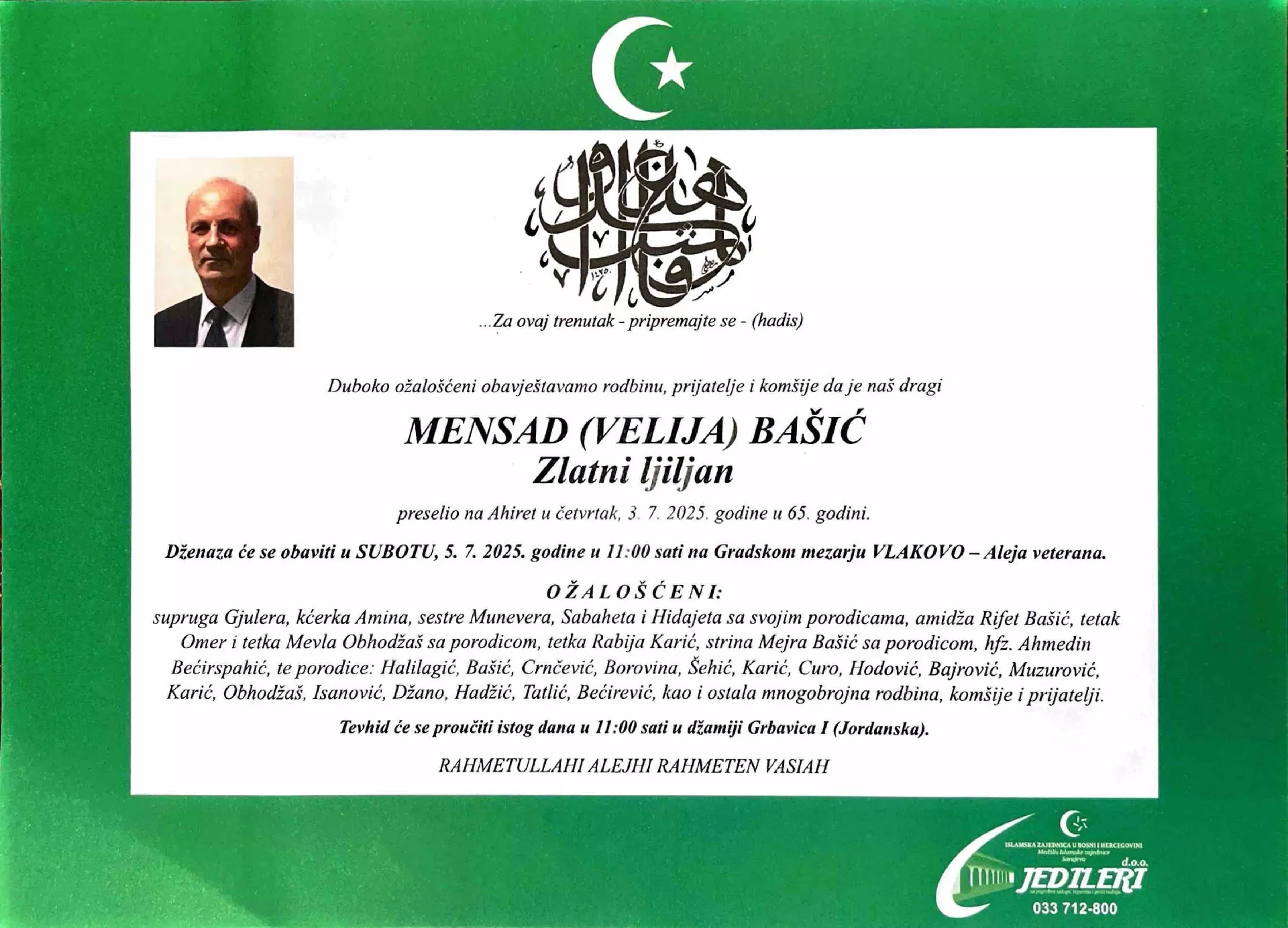 (Patria) - Mensad (Velija) Bašić, dobitnik najvišeg ratnog priznanja "Zlatni ljiljan", preminuo je u četvrtak, 3. jula 2025. godine, u 65. godini života, nakon borbe sa teškom bolešću.