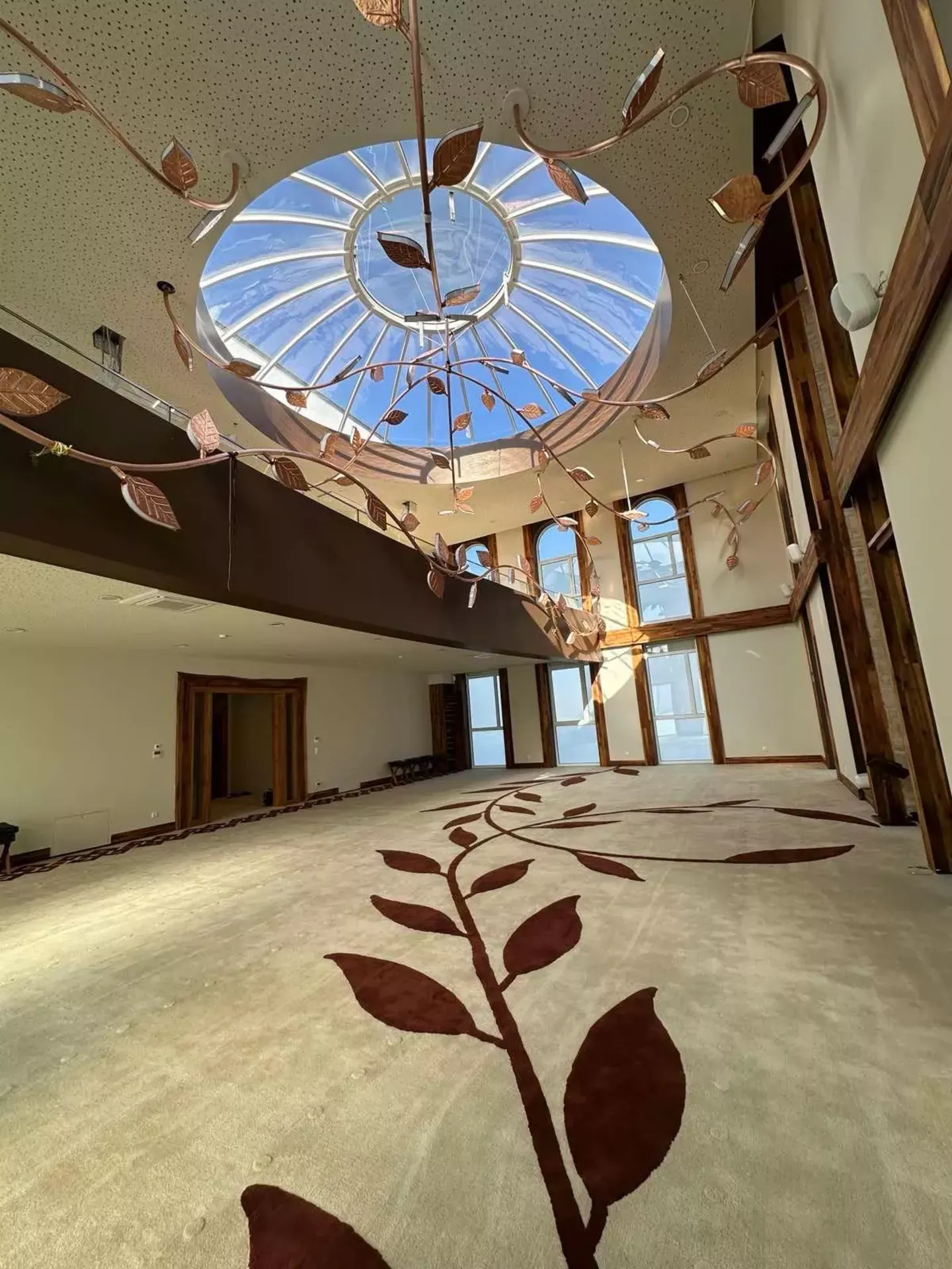Enterijer ove džamije oduševljava svakoga ko kroči njenim pragom. Centralni luster, remek-djelo simbolike i umijeća, oblikovan je u sedam loza koje predstavljaju sedam nebesa, dok se iz njega spušta 99 listova, simbolizujući 99 Allahovih najljepših imena. Svjetlost koja se preliva preko tih listova ostavlja utisak nebeske nježnosti, podsjećajući vjernike na širinu i milost Stvoritelja.