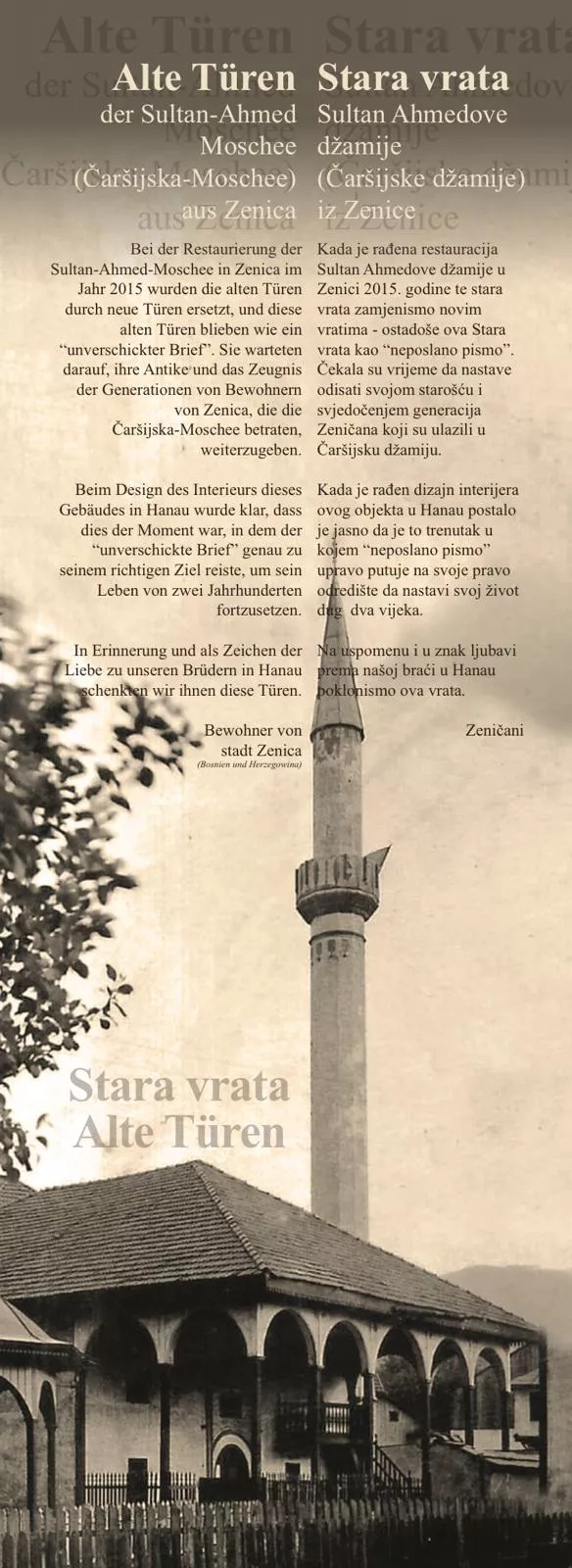 Možda najposebniji detalj ovog zdanja jesu vrata koja će uskoro krasiti džamiju u Hanau — vrata iz Sultan Ahmedove džamije u Zenici. Nakon restauracije te džamije, umjetnik Saladin Pašalić, ujedno i autor enterijera džamije u Hanau, sačuvao je ova vrata, nazivajući ih "neposlanim pismom". Sada, ta nikada pročitana poruka, pronaći će svoj dom među bošnjačkom dijasporom, simbolično povezujući dva grada, dvije džamije i bezbroj sudbina koje nose ime Bosne u srcu.