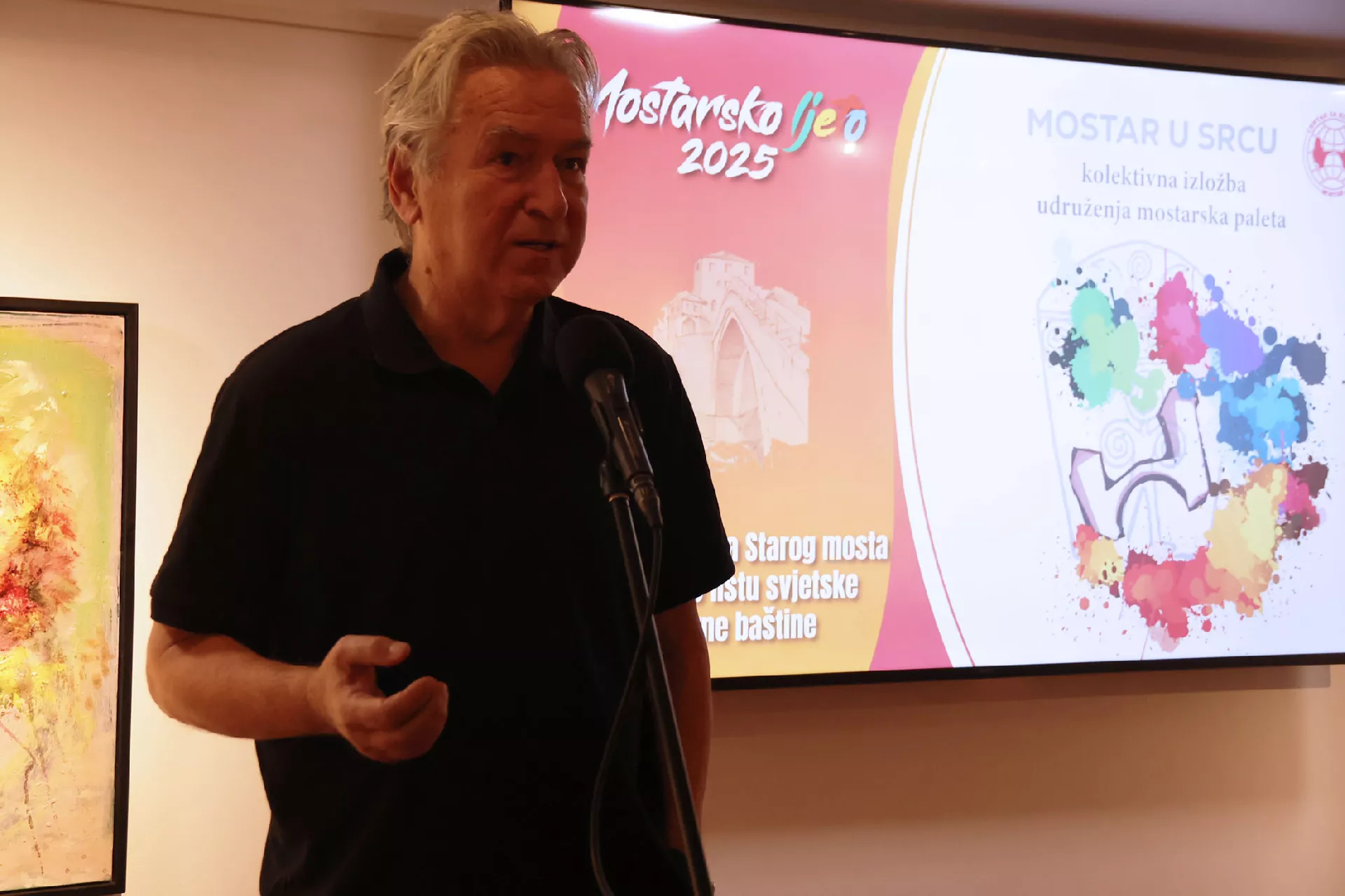 (Patria) - U punoj sali Centra za kulturu Mostar sinoć je upriličena velika kolektivna izložba članova Udruženja umjetnika „Mostarska paleta“ i njihovih prijatelja pod nazivom „Mostar u srcu“, a izložbu je proglasio otvorenom istaknuti akademski slikar prof. dr. Salko Pezo.