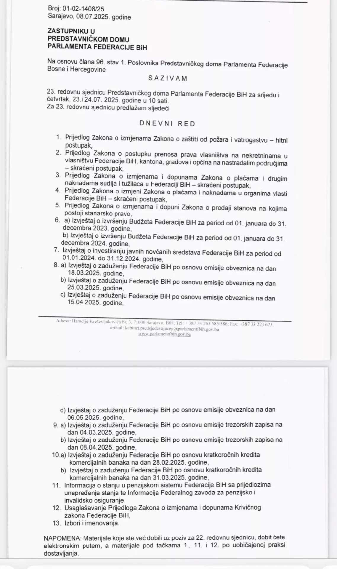 - Iako je sjednica planirana da traje dva dana, 23. i 24. jula, u političkim kuloarima Sarajeva već kruže informacije da vladajuća većina razmatra mogućnost da sve tačke završi u jednom danu.