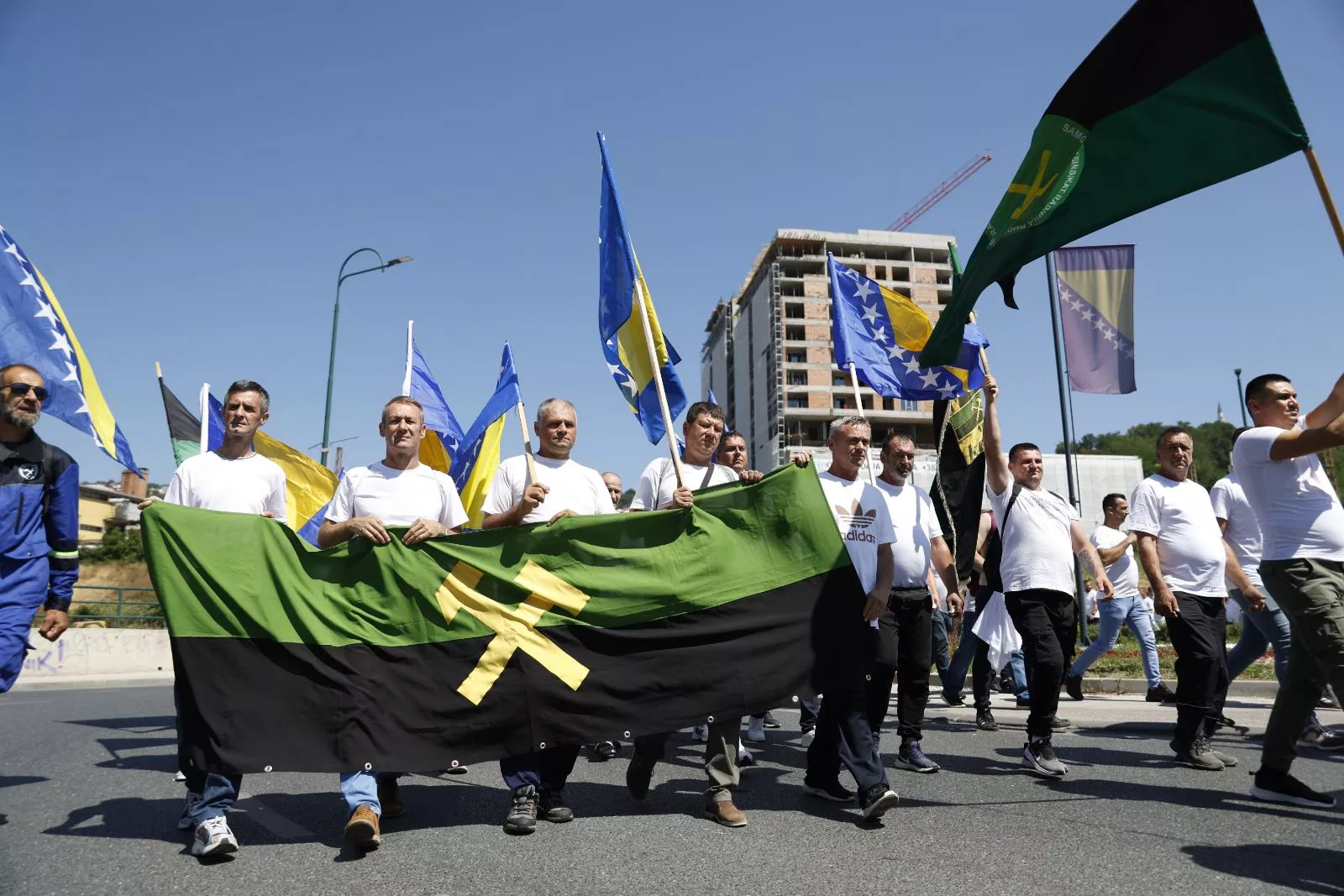 Protest je započeo intoniranjem himne Bosne i Hercegovine, a učesnici su pješačili u koloni od željezničke stanice do zgrade Vlade. Saobraćaj u ulici Hamdije Čemerlića je zbog protesta bio obustavljen.