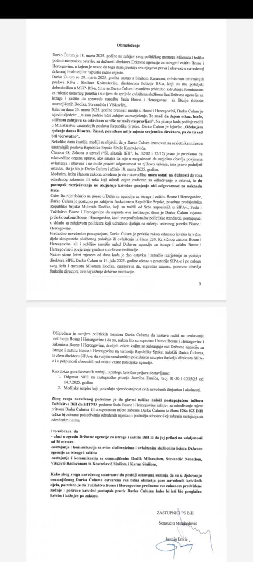 "Darko Ćulum dana 14.07.2025. je došao u sjedište SIPA-e sa namjerom da obavlja dužnost direktora iako zna da takva ovlaštenja niti status više nema po sili zakona jer je u skladu sa članom 119. Zakona o policijskim službenicima utvrđeno da policijskom službeniku prestaje radni odnos i automatski gubi status policijskog službenika u slučaju kada svojevoljno podnese ostavku, usljed čega se neovlašteno nalazi u zgradi SIPA-e", navodi se u prijavi.