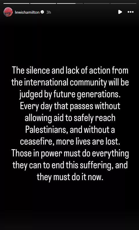 "Teško je pronaći riječi kojima bih opisao potpuni užas koji osjećam gledajući što se događa u Gazi. Djeca gladuju dok humanitarne organizacije ne mogu sigurno dostaviti ljudima hranu, čistu vodu, medicinske potrepštine i najosnovnije ljudske potrebe. Za to nema opravdanja. Šutnju i nedostatak djelovanja međunarodne zajednice sudit će buduće generacije. Svaki dan koji prođe bez dopuštanja da pomoć sigurno stigne do Palestinaca i bez primirja, gubi se sve više života. Oni na vlasti moraju učiniti sve što mogu kako bi okončali ovu patnju, i to moraju učiniti sada", napisao je, između ostalog Hamilton, objavivši seriju fotografija i poruka na društvenoj mreži Instagram.