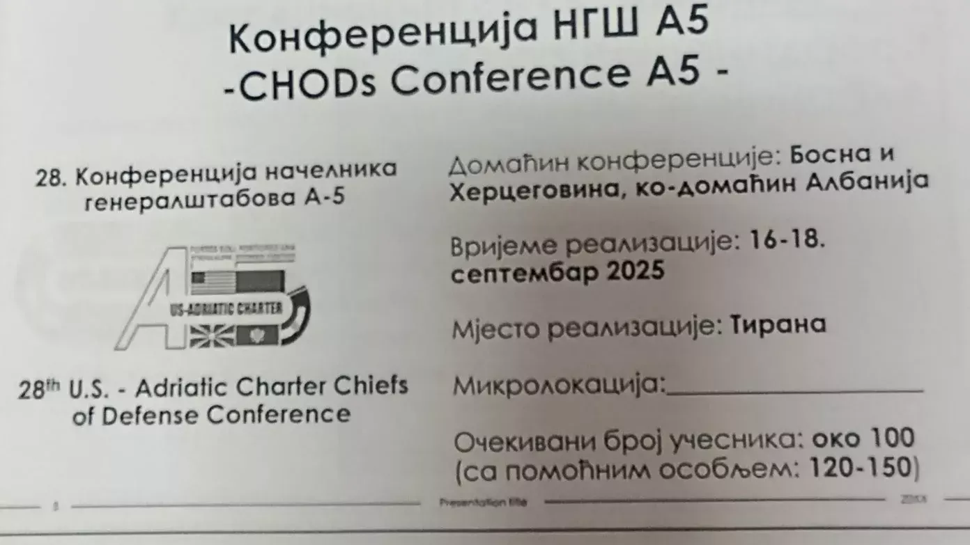 Bosna i Hercegovina je zvanično domaćin 28. Konferencije načelnika generalštabova A5 (U.S.–Adriatic Charter Chiefs of Defense – CHODs Conference), planirane za 16–18. septembar 2025. godine.