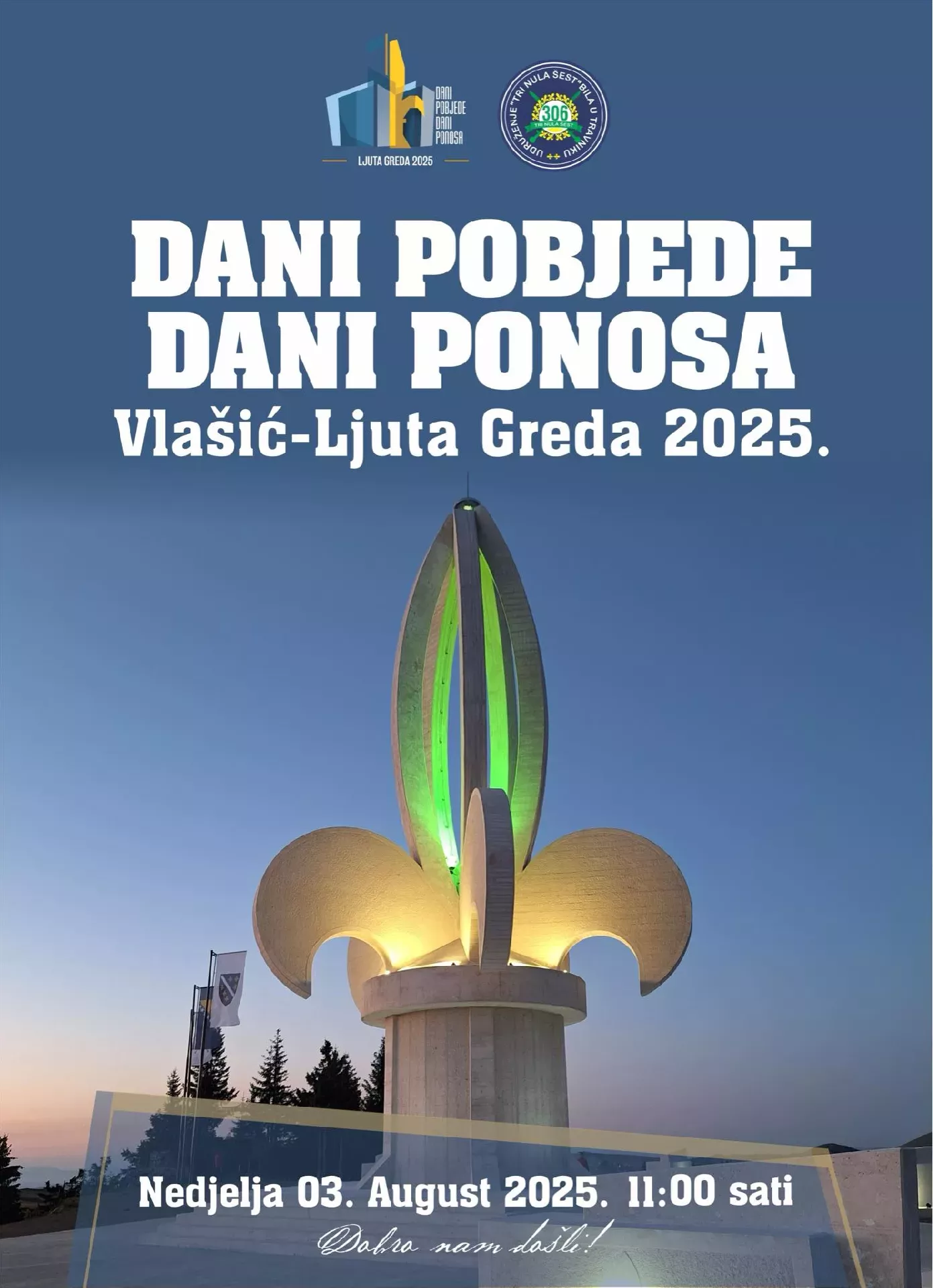 (Patria) - U organizaciji boračkih udruženja i uz podršku lokalnih i viših nivoa vlasti, treću godinu zaredom bit će upriličena manifestacija "Dani pobjede, dani ponosa – Vlašić, Ljuta Greda 2025“, koja će se održati danas u Memorijalnom parku “Slobode i mira”, kod spomen obilježja „Ljiljan“ na lokalitetu Ljuta Greda, s početkom u 11.00 sati.