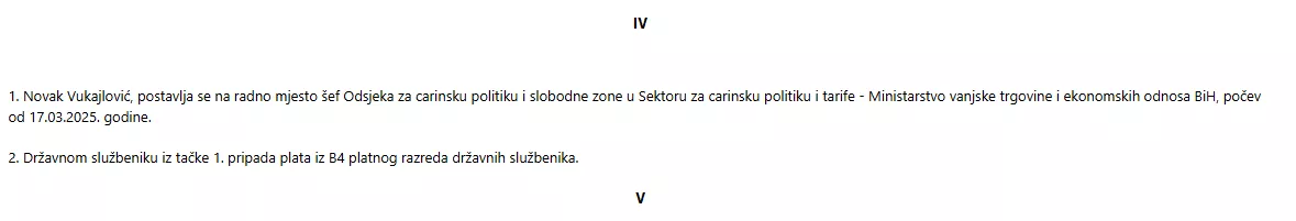Na njegovo mjesto Košarac je postavio Novaka Vukajlovića kao vršioca dužnosti pomoćnika, iako Zakon o državnoj službi ne poznaje termin vršilac dužnosti. Vukajlović je bio šef Odsjeka za carinsku politiku i slobodne zone, a ranije je bio šef Kabineta ministra koji je i njegov stranački drug. Vukajlović je za šefa Odsjeka imenovan u martu 2025. godine, a sada je dodatno unaprijeđen.