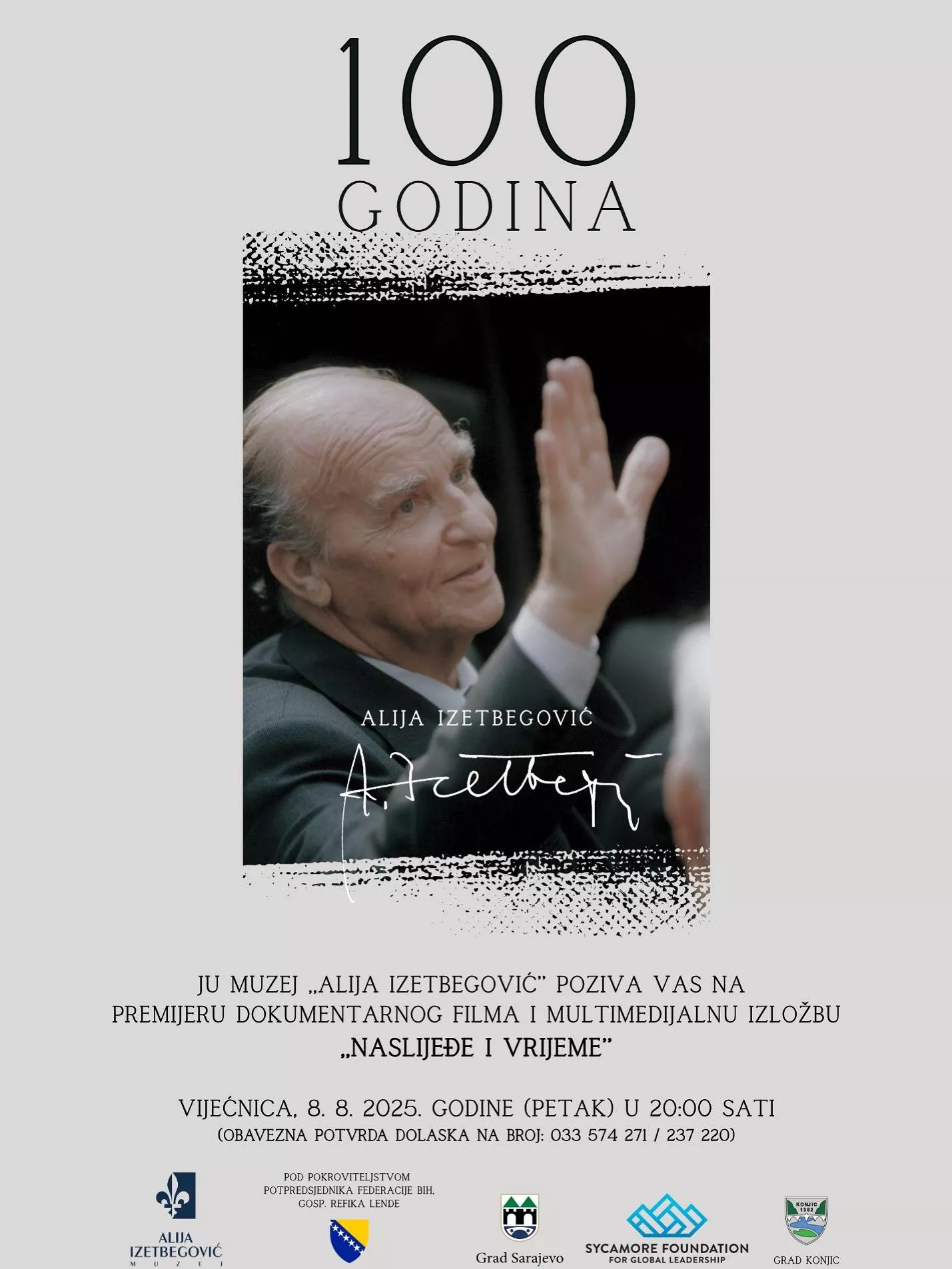 (Patria) - JU Muzej „Alija Izetbegović“ u sarajevskoj Vijećnici prikazat će dokumentarni film "Naslijeđe i vrijeme" koji će biti predstavljen u sklopu svečanog programa obilježavanja 100. godišnice rođenja prvog predsjednika Predsjedništva Bosne i Hercegovine, Alije Izetbegovića.