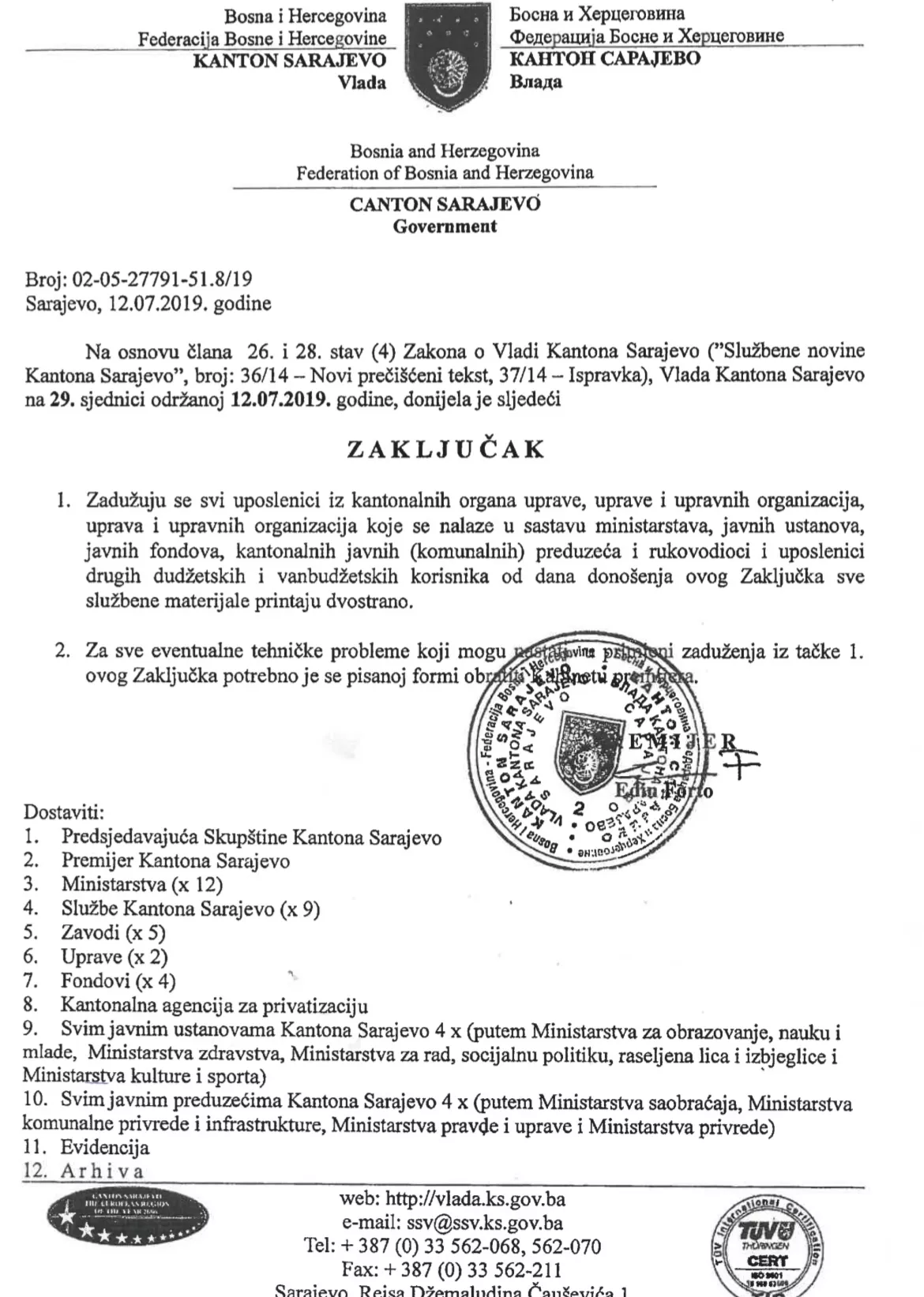 On je tada predložio da se službeni materijali printaju dvostrano. A danas je Kanton Sarajevo pred finansijskim slomom.