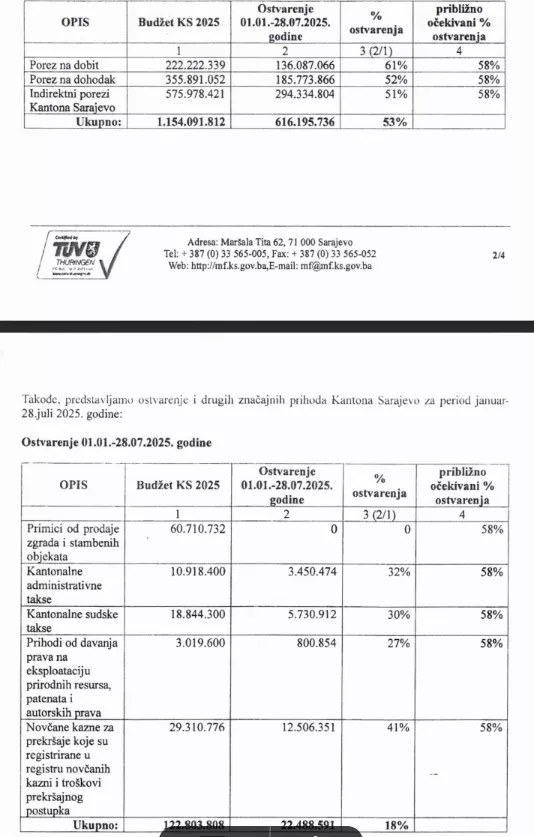 Evo kako izgleda ostvarenje prihoda u KS od januara do 28. jula 2025. godine: