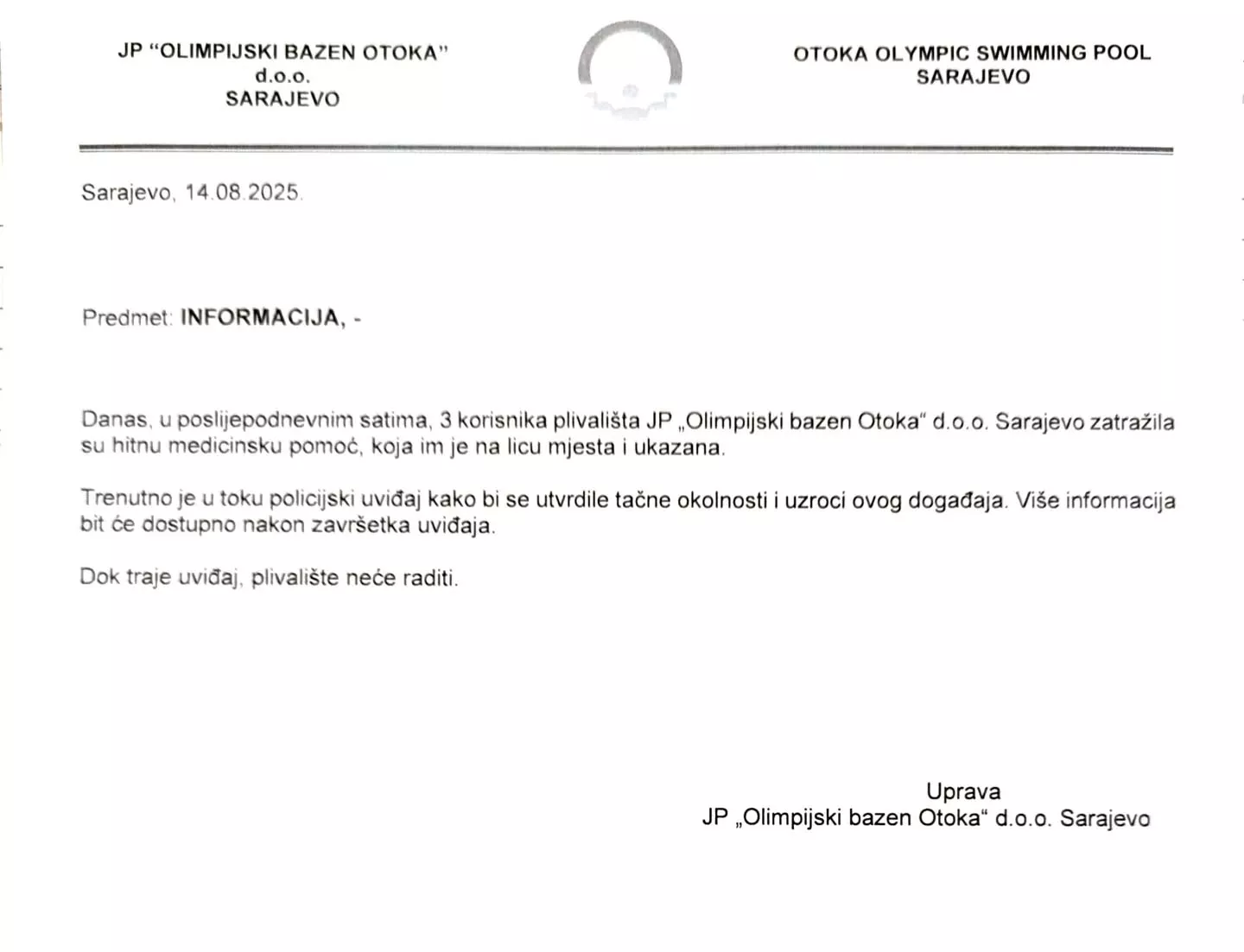 "Danas, u poslijepodnevnim satima, tri korisnika plivališta JP Olimpijski bazen Otoka d.o.o. Sarajevo zatražila su hitnu medicinsku pomoć, koja im je na licu mjesta i ukazana.