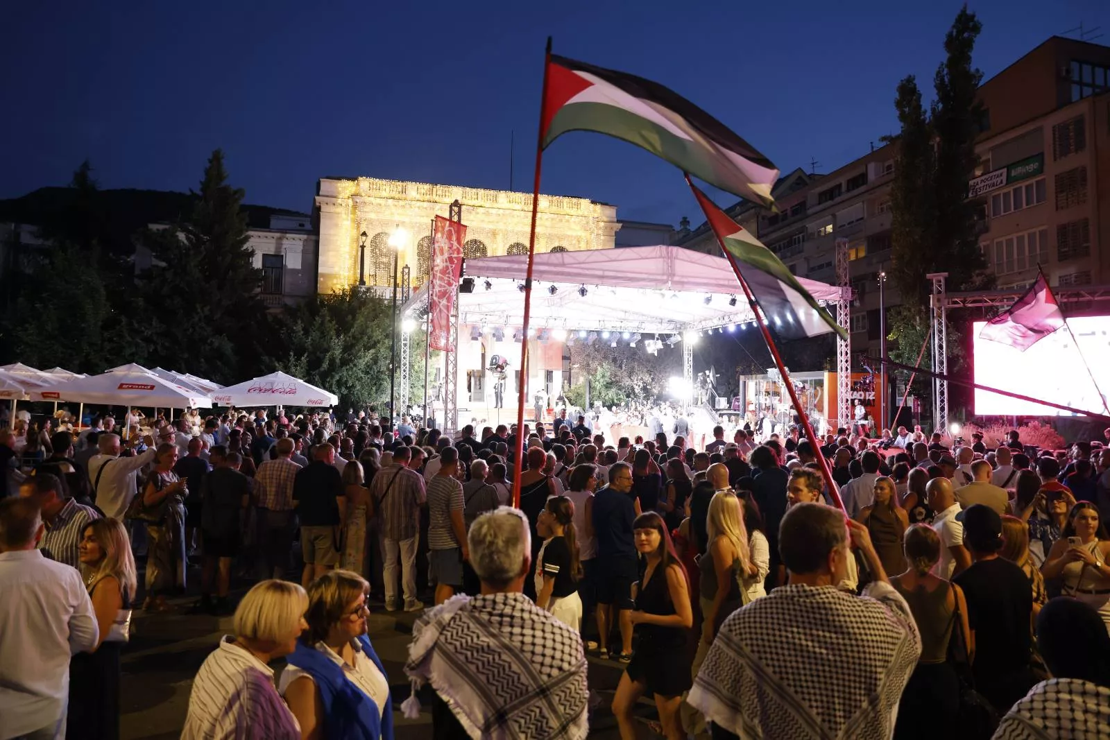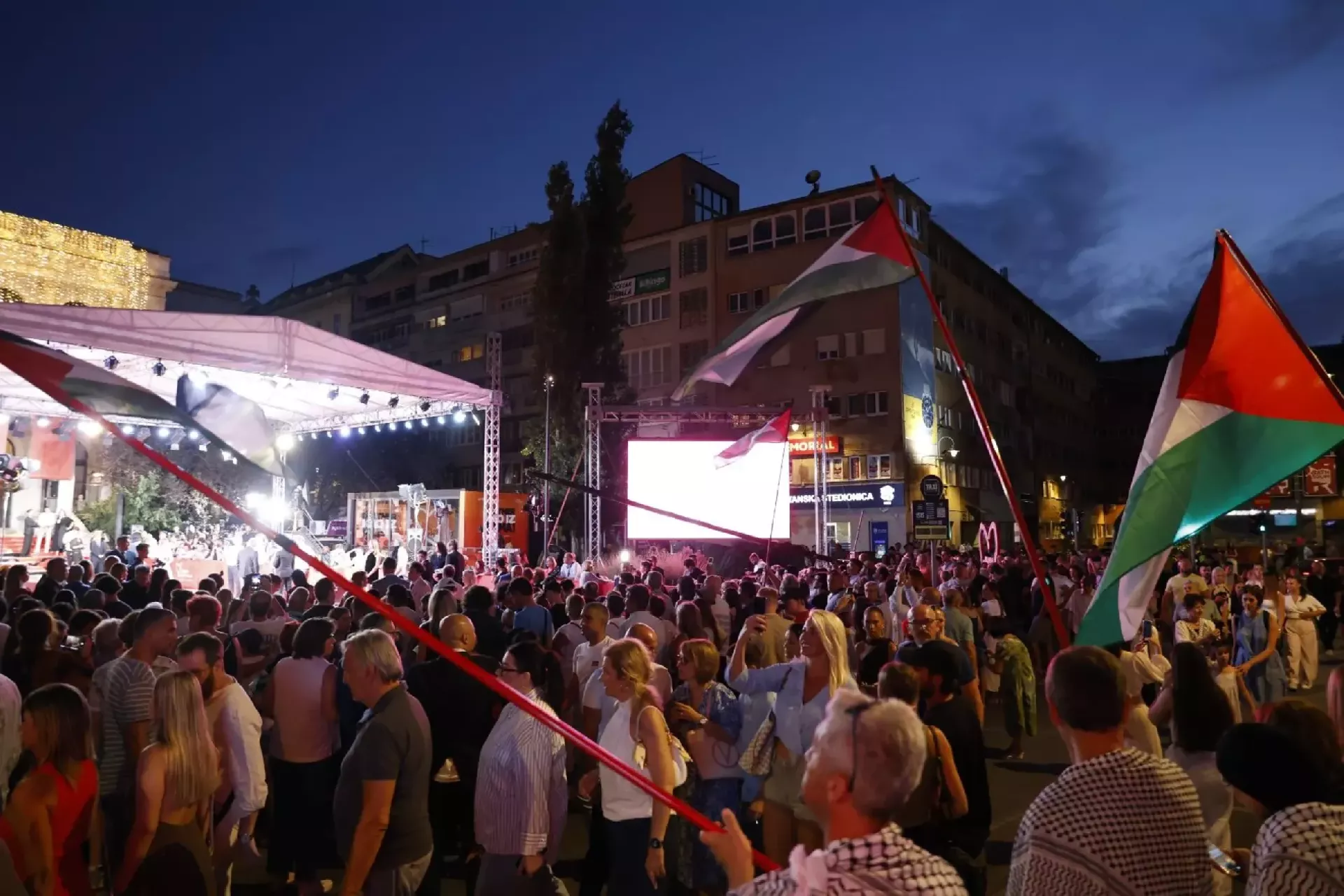 (Patria) - Neposredno pred otvaranje 31. Sarajevo Film Festivala (SFF), preko puta Narodnog pozorišta Sarajevo okupila se grupa građana s palestinskim zastavama i transparentima s porukama podrške palestinskom narodu.