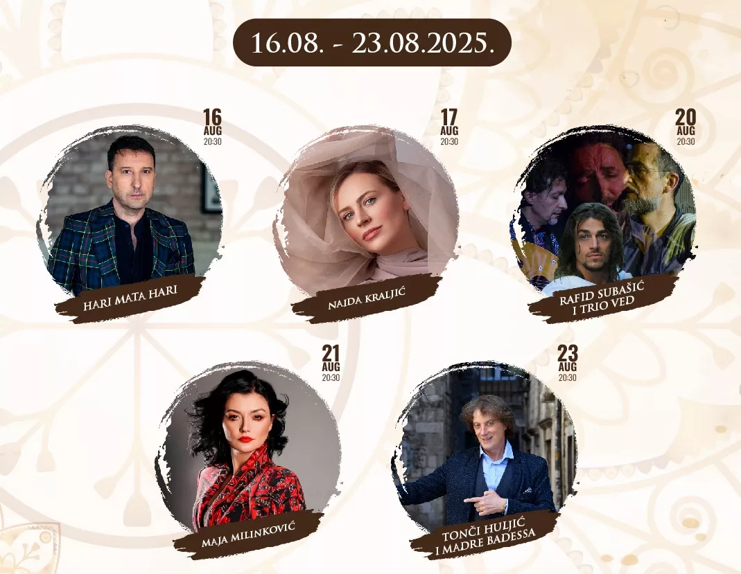 Nakon nastupa Harija Varešanovića drugo veče, u nedjelju 17. avgusta, na programu je koncert sarajevske interpretatorice sevdalinki i tradicionalne muzike, Naide Kraljić. Do kraja festivala publika će još imati priliku uživati u nastupima: Rafida Subašića, vrsnog vokalnog interpretatora i jednog od najboljih perkusionista u regionu sa pratnjom Trio Veda (srijeda, 20. august), Maje Milinković, poznate pjevačice i kantautorice, koja će publici ponuditi spoj fada i sevdalinke (četvrtak, 21. august), dok će festival zatvoriti sjajni Tonči Huljića i bend Madre Badessa, koji donose kombinaciju mediteranskog melosa, popa, klasike i etno zvuka (subota, 23. august).