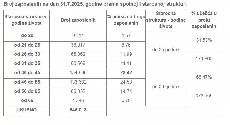 U prvih šest mjeseci broj zaposlenih je oscilirao, a tokom aprila, maja i juna rastao je broj zaposlenih. No, podaci za mjesec juli pokazuju da je broj zaposlenih za samo mjesec pao za 2.037 osoba. Na dan 31.7.2025. godine je 545.018 zaposlenih osoba.