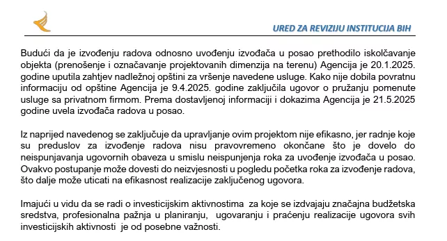 Budući da je izvođenju radova odnosno uvođenju izvođača u posao prethodilo iskolčavanje objekta (prenošenje i označavanje projektovanih dimenzija na terenu) Agencija je 20.1.2025. godine uputila zahtjev nadležnoj opštini za vršenje navedene usluge. Kako nije dobila povratnu informaciju od opštine Agencija je 9.4.2025. godine zaključila ugovor o pružanju pomenute usluge sa privatnom firmom. Prema dostavljenoj informaciji i dokazima Agencija je 21.5.2025 godine uvela izvođača radova u posao. Iz naprijed navedenog se zaključuje da upravljanje ovim projektom nije efikasno, jer radnje koje su preduslov za izvođenje radova nisu pravovremeno okončane što je dovelo do neispunjavanja ugovornih obaveza u smislu neispunjenja roka za uvođenje izvođača u posao. Ovakvo postupanje može dovesti do neizvjesnosti u pogledu početka roka za izvođenje radova, što dalje može uticati na efikasnost realizacije zaključenog ugovora. Imajući u vidu da se radi o investicijskim aktivnostima za koje se izdvajaju značajna budžetska sredstva, profesionalna pažnja u planiranju, ugovaranju i praćenju realizacije ugovora svih investicijskih aktivnosti je od posebne važnosti”, navodi se u izvještaju revizora.