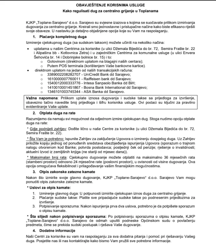 Napominjemo da se, po izmirenju cjelokupnog dugovanja sa sudskim troškovima, sa korisnicima potpisuje Sporazum o otpisu kamata, nakon čega se upućuju podnesci Općinskom sudu o povlačenju prijedloga za izvršenje", navodi se u saopćenju KJKP Toplane-Sarajevo.