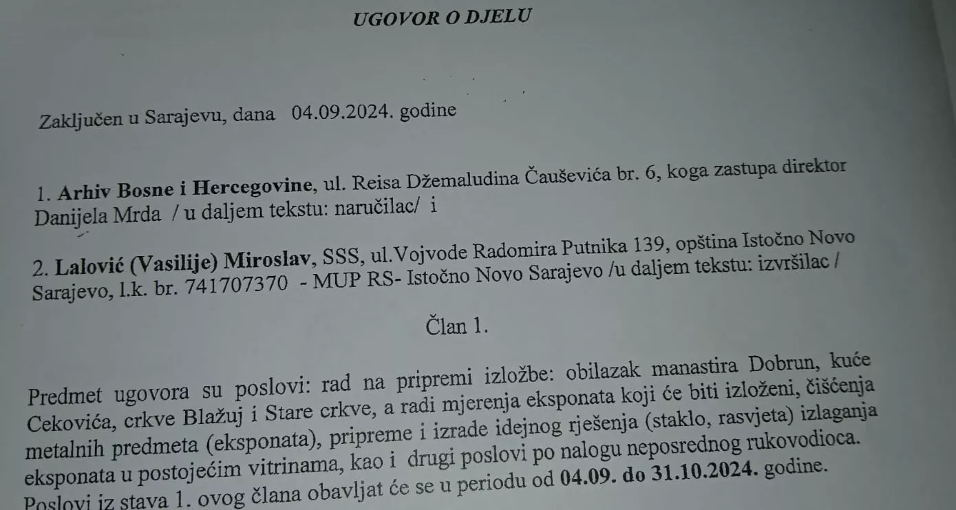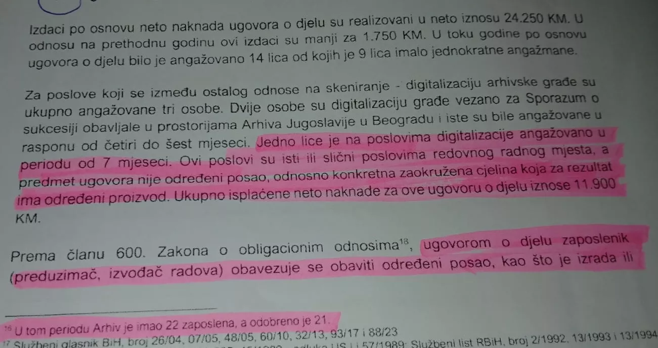 Fiktivni ugovori postali su pravilo, plaćane su izložbe koje nikada nisu održane, prevodi dokumenata koji su već ranije urađeni, te popravke koje nisu ni započete. Ugovori su potpisivani i sa najbližim rođacima. Tako je direktorica za pripremu izložbe „Kultura Srba u Sarajevu“ angažovala zeta Miroslava Lalovića, a njegova naknada iznosila je 2.000 KM iako su posao već obavili uposlenici Arhiva.