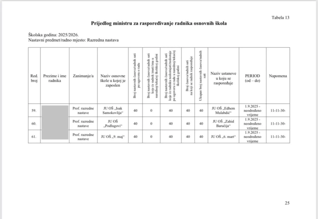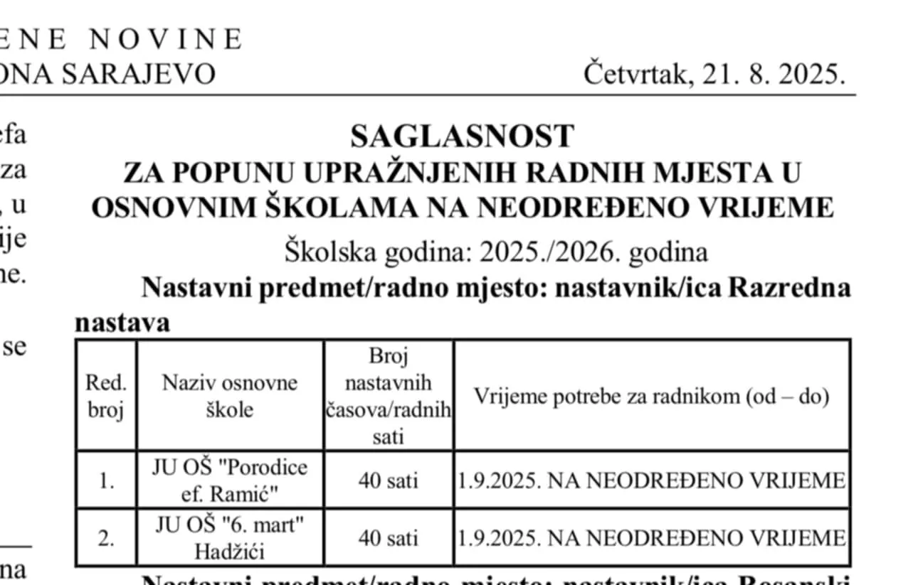 "Uvidom u Odluku kojom se daje saglasnost osnovnim školama kao javnim ustanovama na području Kantona Sarajevo za popunu upražnjenih radnih mjesta - zaključenje ugovora o radu na neodređeno radno vrijeme za 60 (šezdeset) radnih mjesta (Službene novine Kantona Sarajevo 33/25), ostali smo zatečeni jer navedenom odlukom nije data saglasnost radnog mjesta razredne nastave u JU OŠ ˝Edhem Mulabdić˝ Sarajevo, za Selmu Paralović Jažić.