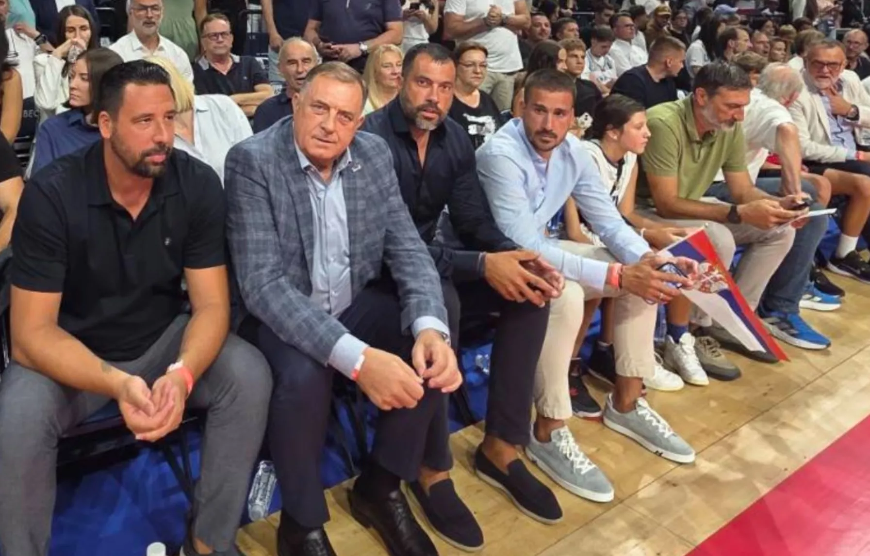 U Areni se igra prijateljska košarkaška utakmica između Srbije i Slovenije, a tik pored terena sedi i Milorad Dodik, predsednik Republike Srpske sa oduzetim mandatom.