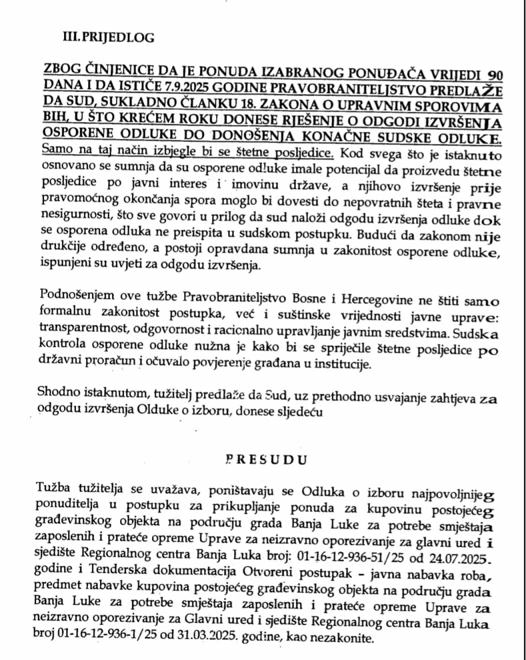 U toj dokumentaciji nalazi i se i tužba podnesena Sudu BiH 22. avgusta, a u kojoj Pravobranilaštvo BiH traži da Sud, u skladu sa članom 18. Zakona o upravnim sporovima u što kraćem roku donese rješenje o odgodi izvršenja osporene odluke do donošenja konačne sudske odluke, a iz razloga što ponuda izabranog ponuđača vrijedi 90 dana i ističe 7. septembra 2025. godine.