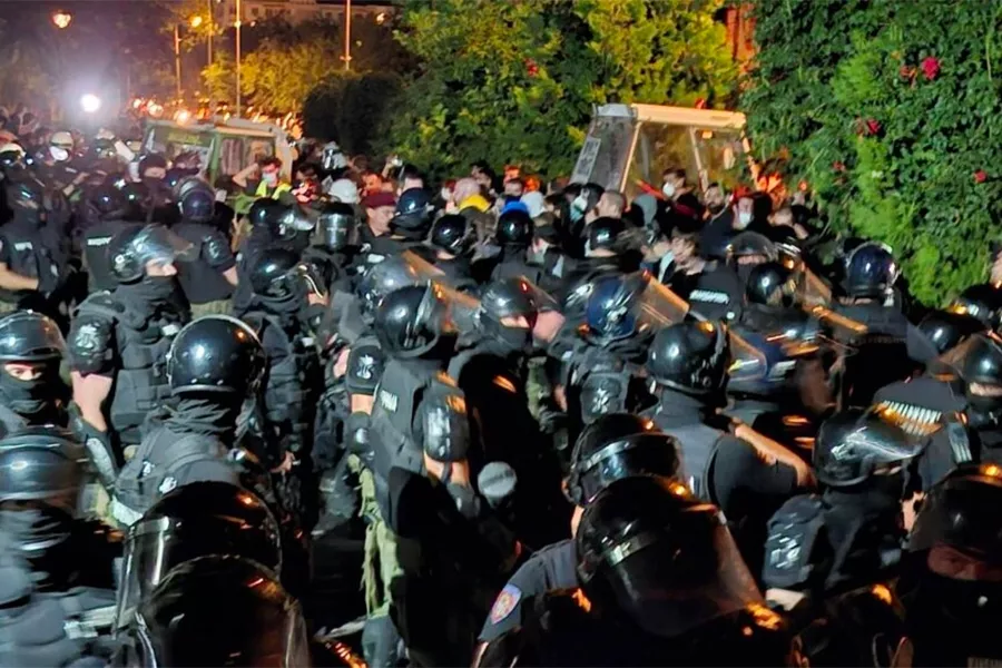 „Spustite štitove!“, „Sklonite policiju!“ – uzvikivali su okupljeni studenti, profesori i građani, među kojima su bili i ratni veterani. Na snimcima i fotografijama vidi se da su neki demonstranti nosili kacige, gas maske i antivirusne maske, dok su policijske snage u više navrata upotrijebile pirotehnička sredstva. Još uvijek nije jasno ko je tačno ispalio pirotehniku.