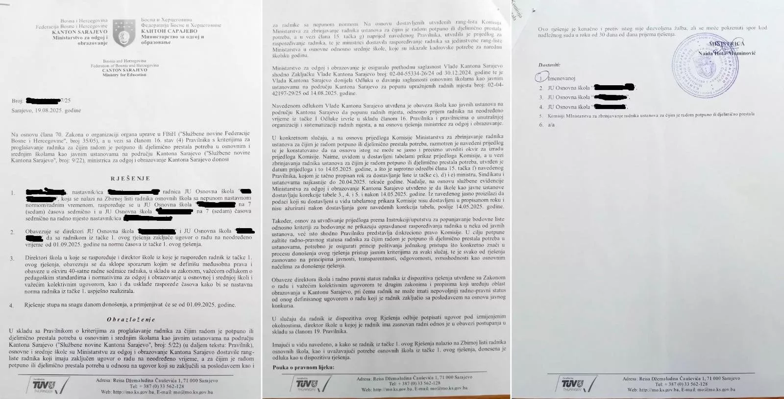 Trenutna situacija je da Ministarstvo za odgoj i obrazovanje Kantona Sarajevo donosi rješenja kojima raspoređuje zaposlenike u osnovne škole i obavezuje direktore škola, i one u koje se raspoređuje, i one iz kojih su raspoređeni, da zaključe ugovor o radu na neodređeno vrijeme i na određenu normu časova, čime se kreira pravni haos.