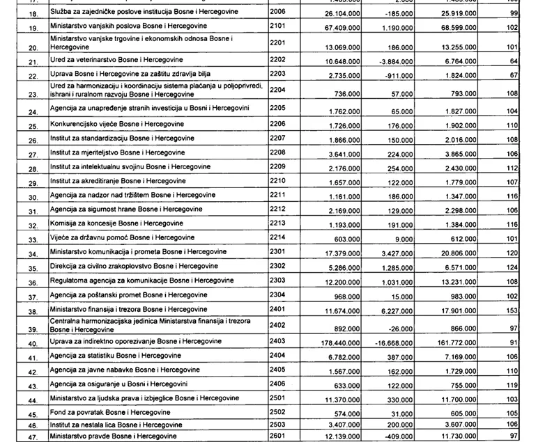 Jedno od najvećih smanjenja budžeta je planirano za Upravu za indirektno oporezivanje, i to za 16.668.000 KM, Ministarstvu pravde BiH umanjenje 409.000 KM, Ministarstvu sigurnosti BiH 915.000 KM.