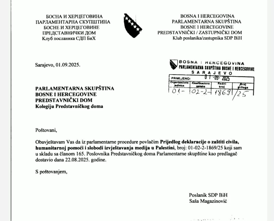 (Patria) - Zastupnik u Predstavničkom domu PS BiH Saša Magazinović (SDP BiH) povukao je iz parlamentarne procedure Prijedlog Deklaracije o zaštiti civila, humanitarnoj pomoći i slobodi izvještavanja medija u Palestini koji je uputio 22. avgusta.