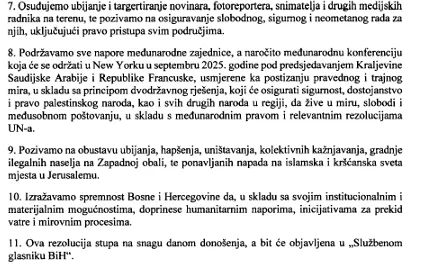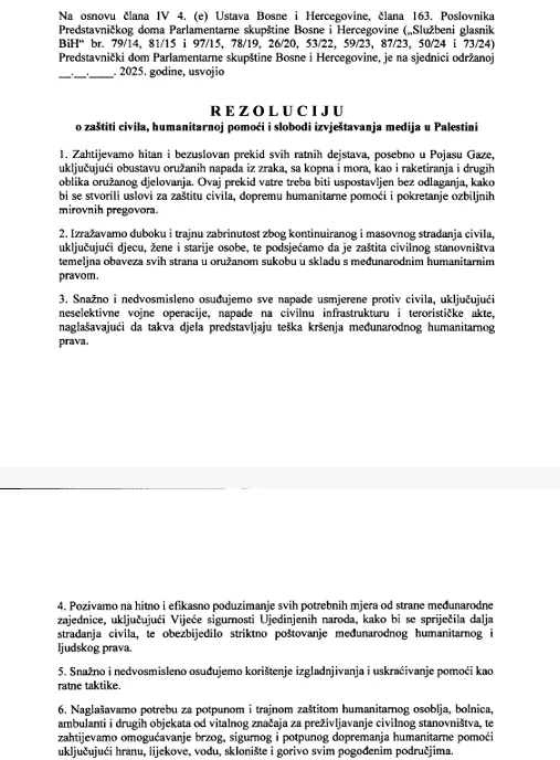 Prijedlog Rezolucije o zaštiti civila, humanitarnoj pomoći i slobodi izvještavanja medija u Palestini.