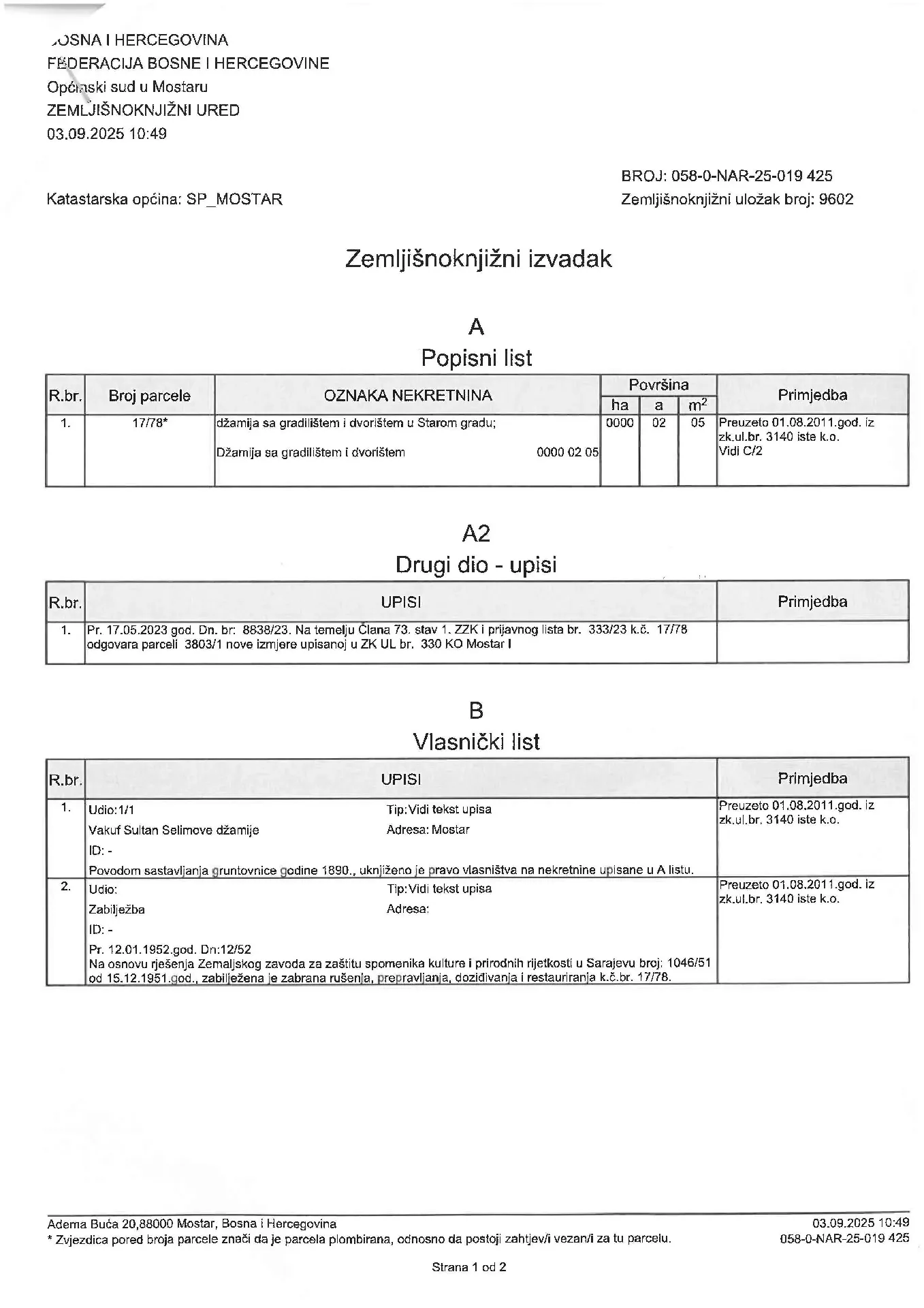 – Premda u dva prethodna državno-pravna uređenja Islamska zajednica nije bila u prilici koristiti ovaj objekat, shodno vlastitim normativnim aktima, objekat se u gruntovnim knjigama Mostara sve vrijeme vodio kao vlasništvo Islamske zajednice 1/1 i nikada nije mijenjao vlasnika. Podučeni iskustvom da domaća javnost nema naviku to propitivati, smatramo važnim još jednom podsjetiti na činjenicu, koju mogu provjeriti svi koji to žele, da je u imovinsko-pravnom smislu i dan-danas objekat tako kategoriziran – navodi se u saopćenju Medžlisa Mostar.