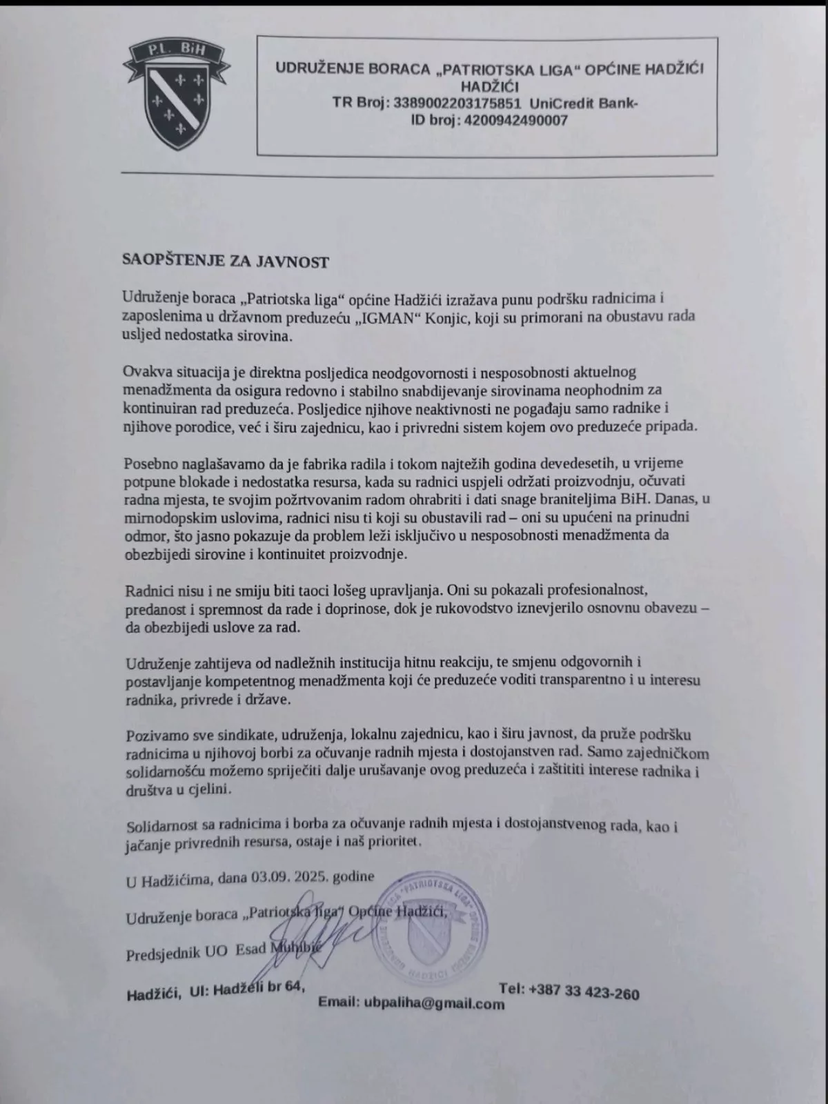 (Patria) - Udruženje boraca „Patriotska liga“ općine Hadžići uputilo je saopštenje za javnost u kojem izražava punu podršku radnicima i zaposlenima u kompaniji „Igman" Konjic, koji su zbog nedostatka sirovina primorani na obustavu rada.
