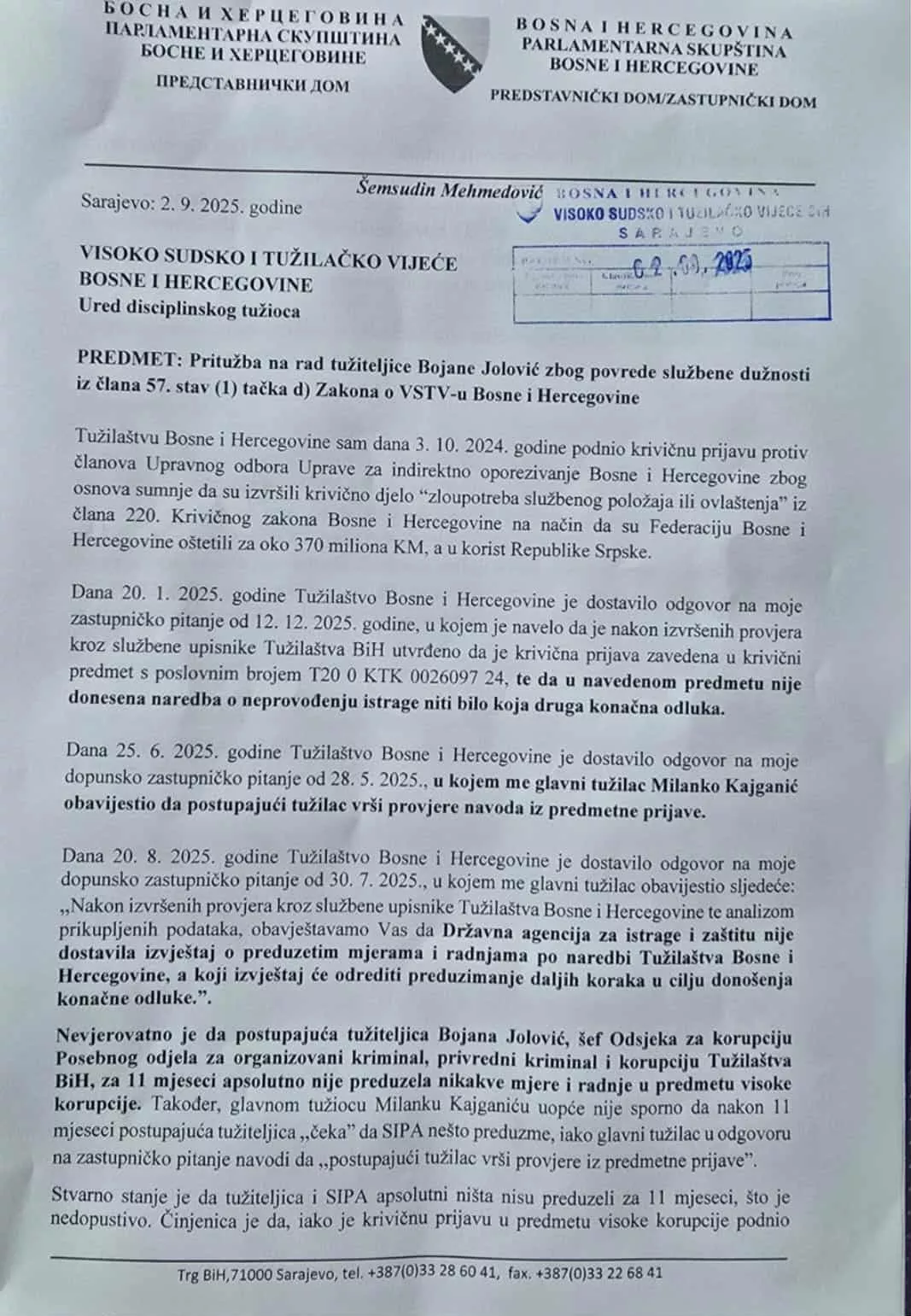 Mehmedović u pritužbi VSTV-u navodi da je Bojana Jolović i šef Odsjeka za korupciju Posebnog odjela za organizovani kriminal, privredni kriminal i korupciju Tužilaštva BiH i da za 11 mjeseci nije poduzela nikakve mjere i radnje u predmetu visoke korupcije.