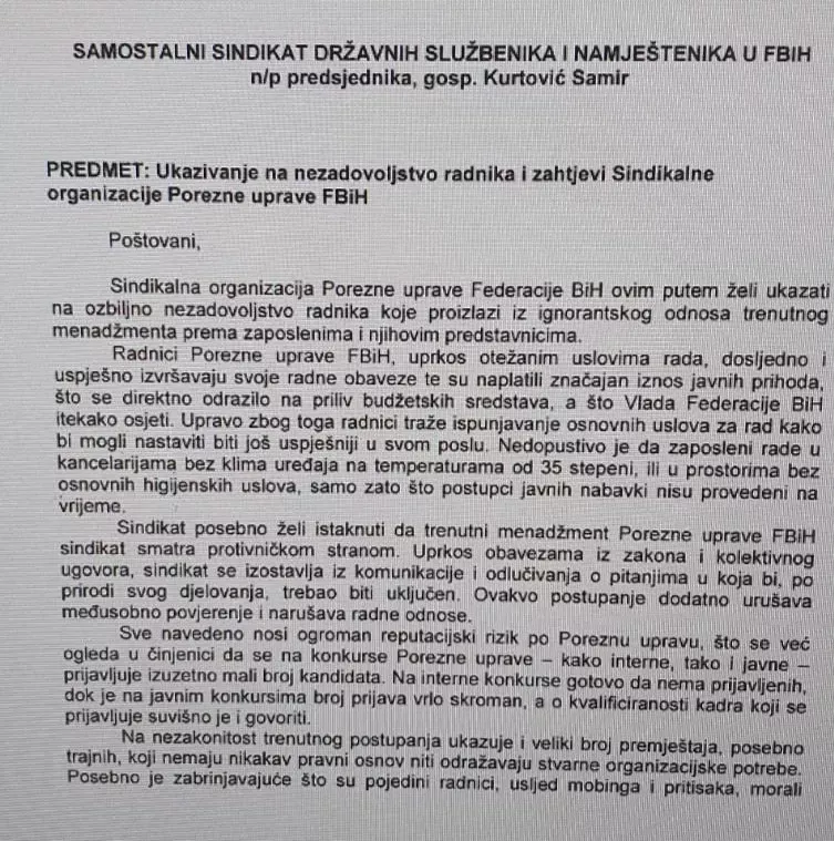 „Ako se naši zahtjevi ne ispune, bit ćemo primorani koristiti sva zakonom dozvoljena sredstva sindikalne borbe“, poručuju radnici Porezne uprave FBiH.