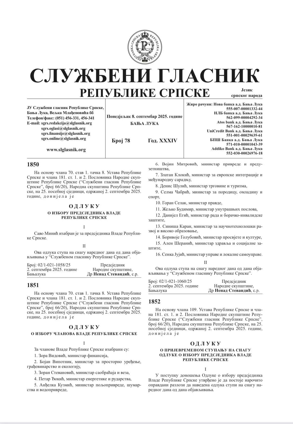 (Patria) - Odluka o izboru predsjednika i nove Vlade entiteta Rs objavljena je danas u Službenom glasniku Rs.