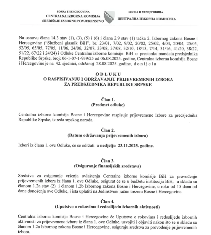 Centralna izborna komisija Bosne i Hercegovine će Uputstvo o rokovima i redoslijedu izbornih aktivnosti za prijevremene izbore usvojiti i objaviti nakon što se osiguraju sredstva za provođenje prijevremenih izbora, i od tog momenta počinju teći rokovi za sve izborne aktivnosti.