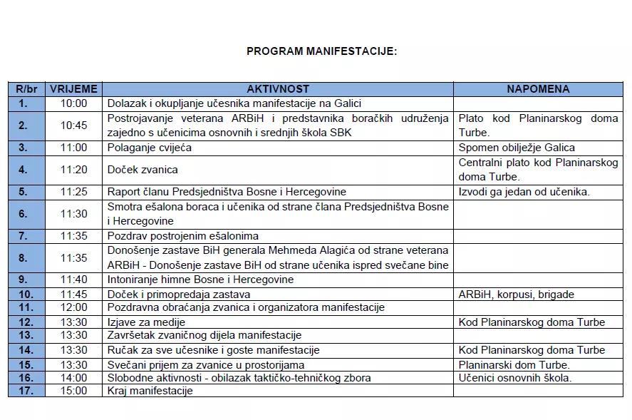 U slučaju nepovoljnih vremenskih uslova, glavni program bit će premješten u PSKC Pirota u Travniku, dok će polaganje cvijeća i odavanje počasti herojima ostati planirano na Galici.