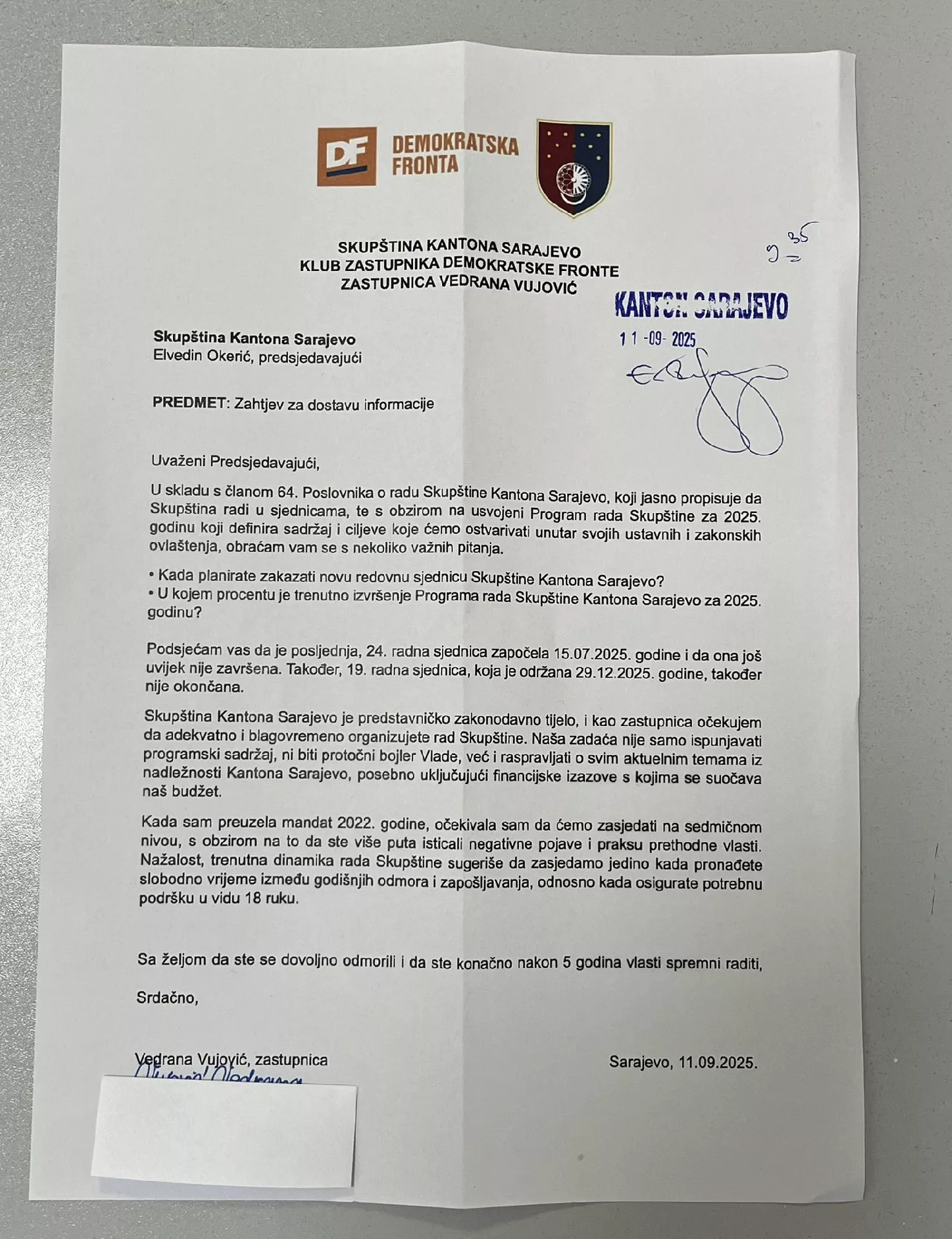 (Patria) - Zastupnica Demokratske fronte u Skupštini KS Vedrana Vujović uputila je 11. septembra predsjedavajućem Skupštine KS Elvedinu Okeriću zahtjev za dostavljanje informacija kada planira zakazati novu redovnu sjednicu Skupštine KS, te u kojem procentu je trenutno izvršenje Programa rada Skupštine KS za 2025. godinu.