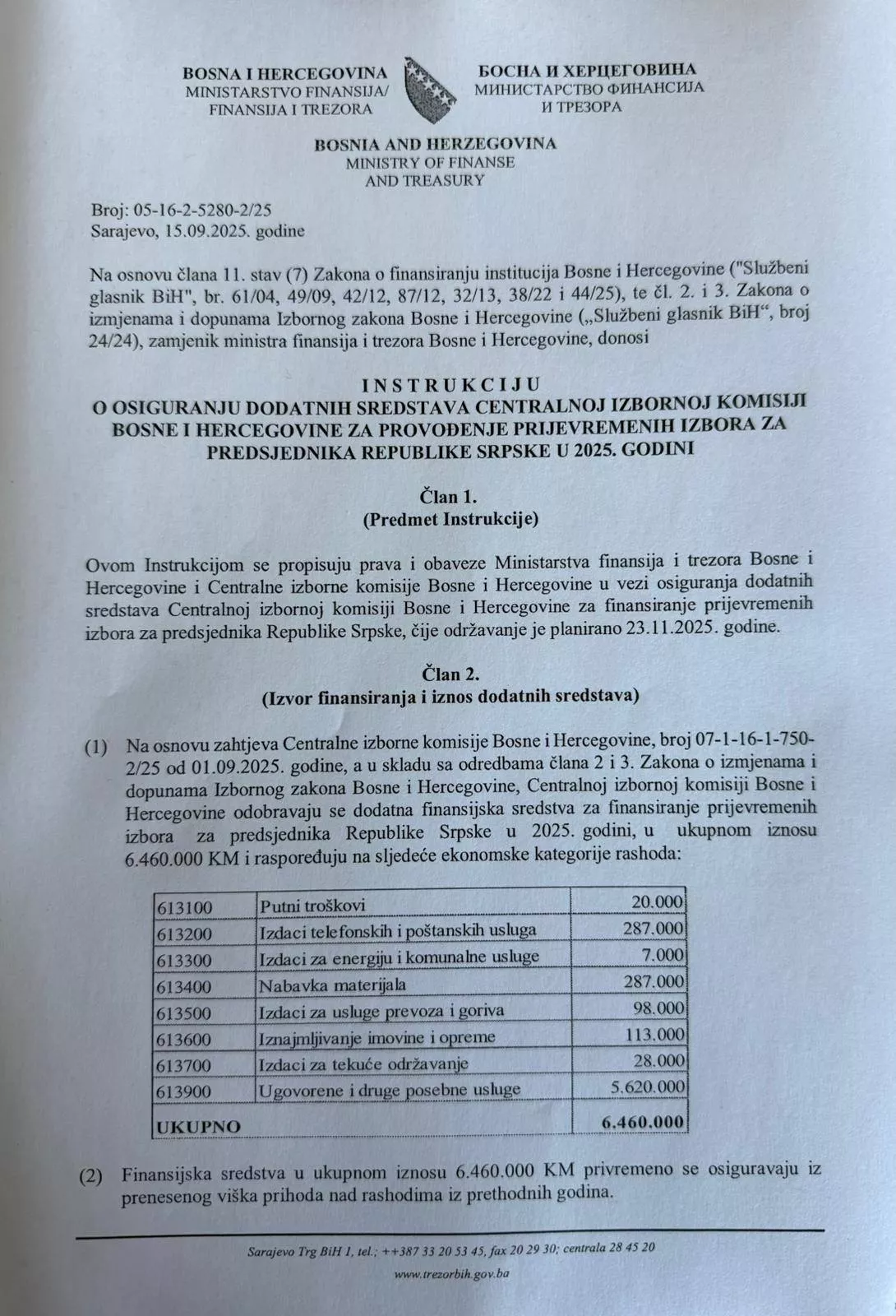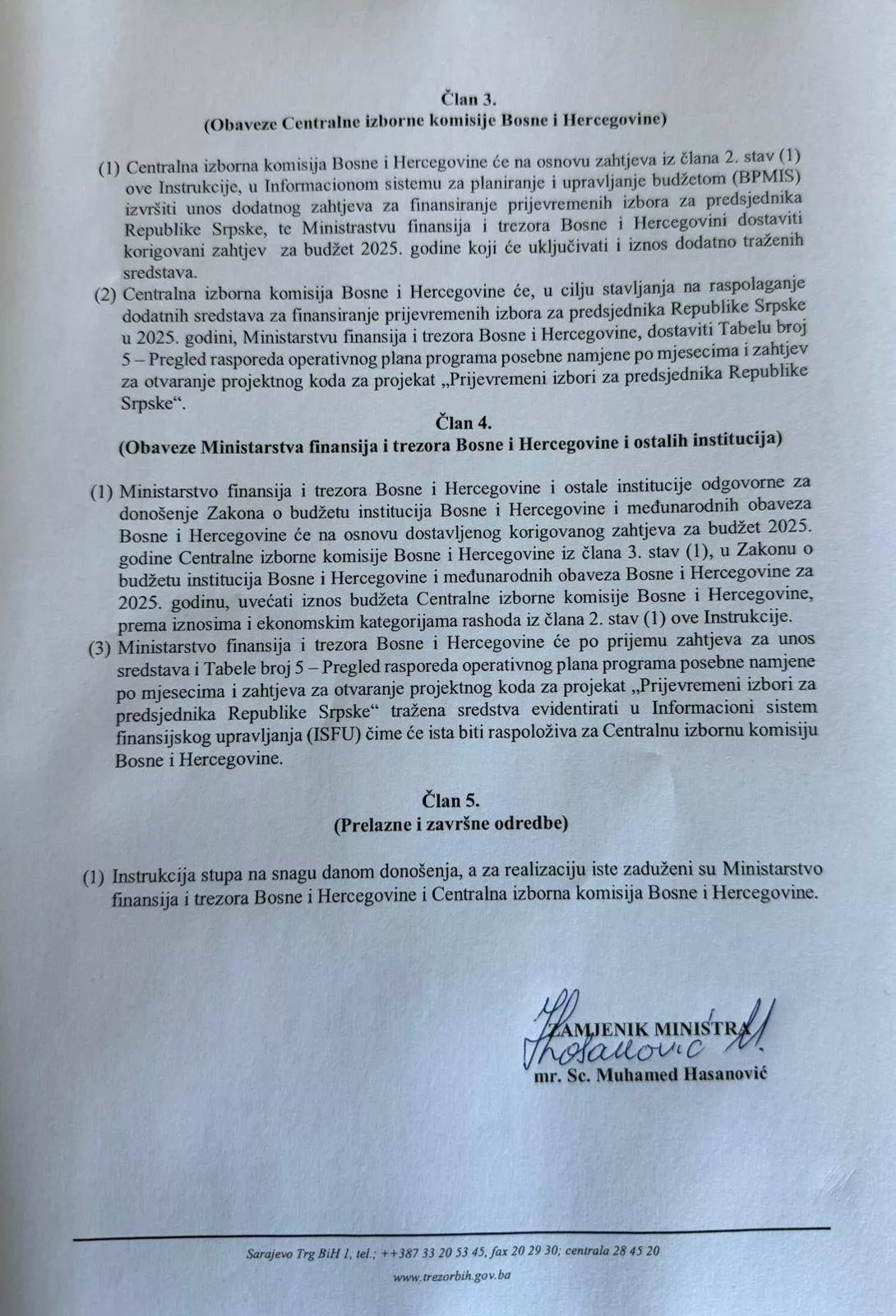 "Odluku o finansiranju prijevremenih izbora sam potpisao, ali ministar odbija da je ovjeri službenim pečatom, čime se onemogućava njeno provođenje. Moj potpis nikada nije bio sporan; zastoje uzrokuju proceduralne opstrukcije unutar samog Ministarstva.