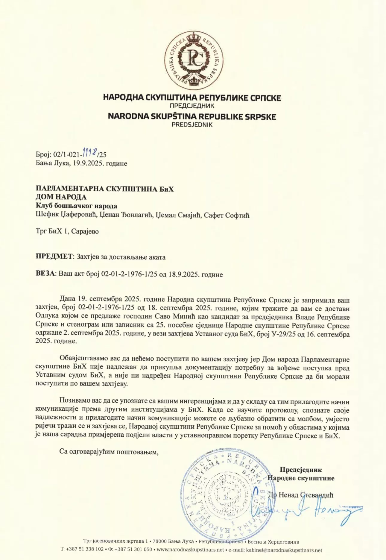 (Patria) - Predsjednik Narodne skupštine Rs Nenad Stevandić obavijestio je delegate Kluba Bošnjaka u Domu naroda PS BiH da im neće dostaviti akt kojim je imenovan mandatar za aktuelni saziv Vlade Rs čije imenovanje se osporava pred Ustavnim sudom BiH.