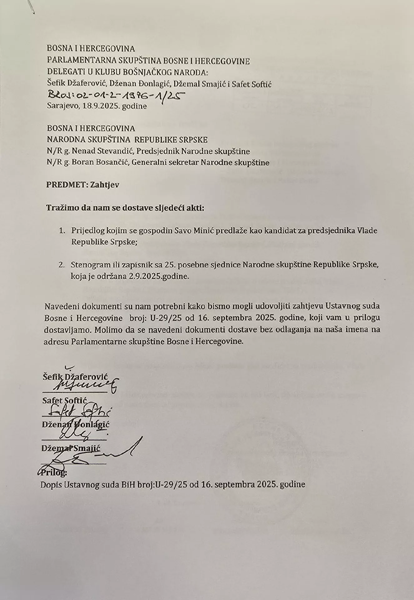 Podsjetimo, Ustavni sud BiH je od delegata koji osporavaju imenovanje Vlade Rs - Šefika Džaferovića, Safeta Softića, Dženana Đonlagića i Džemala Smajića - tražio dokaz da je Savu Minića za mandatara predložio Milorad Dodik, koji u tom trenutku više nije bio predsjednik Rs.