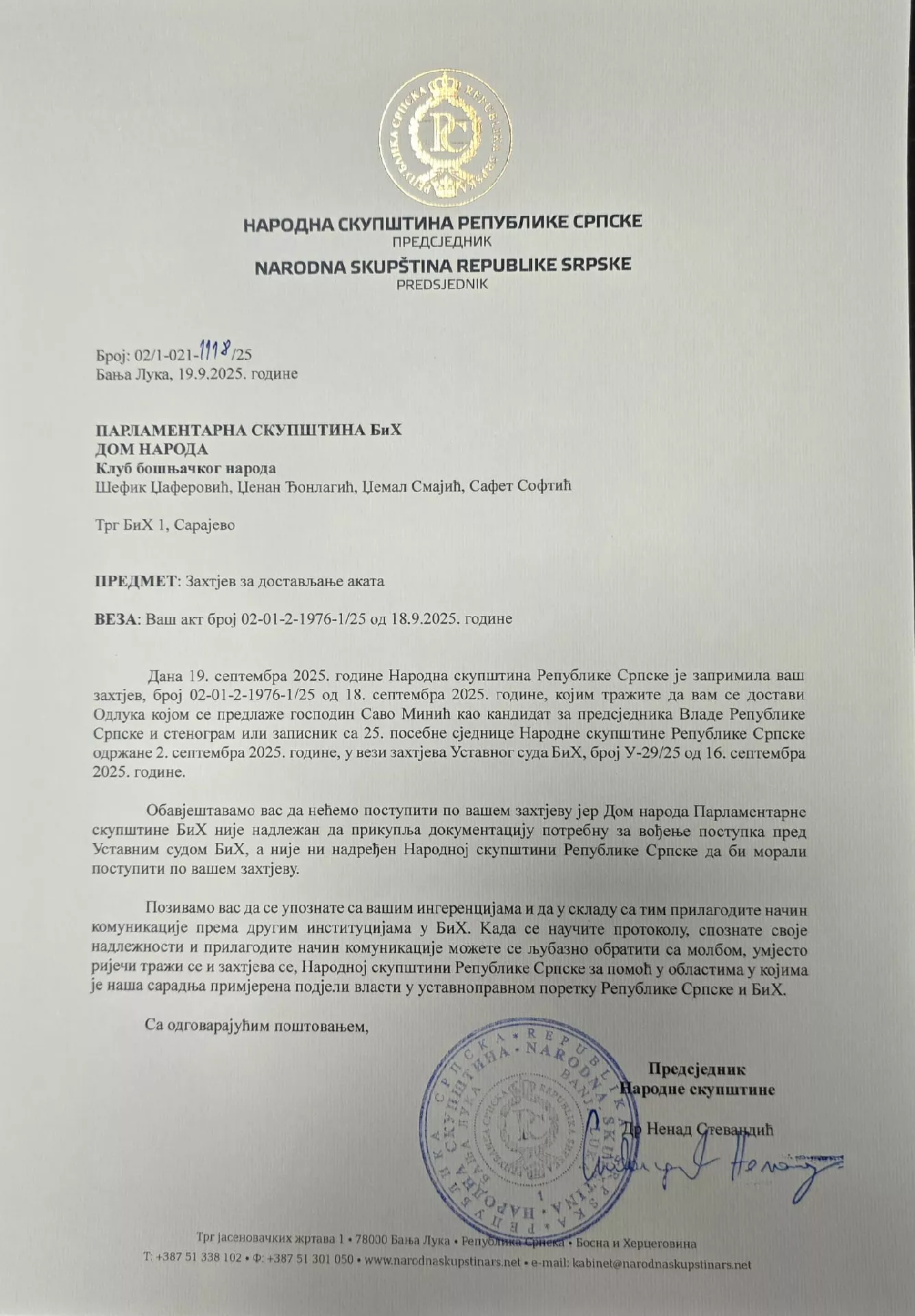 Stevandić je u svom odgovoru, između ostalog, naveo kako ne želi taj dokument dostaviti delegatima jer "Dom naroda PSBiH nije nadređen Narodnoj skupštini Rs".