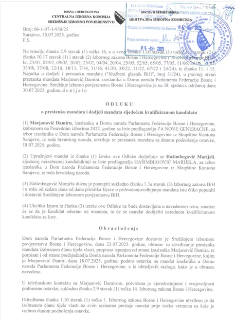 (Patria) - Na narednoj sjednici Doma naroda Parlamenta FBiH koja će biti održana 30. septembra mandat delegatkinje preuzet će Marijela Margeta Hašimbegović (DF) u Klubu Hrvata umjesto Damira Marjanovića (ZNG) koji je u julu podnio ostavku na mandat zastupnika u Skupštini KS.