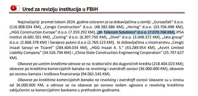 Upravo će i najnoviji revizorski izvještaj koji je negativan za Autoceste FBiH navesti BS Telecom kao jednog od najznačajnijih ponuđača tokom 2024. godine. Utvrđeno je da je ostvaren promet od 7.070.766 KM.