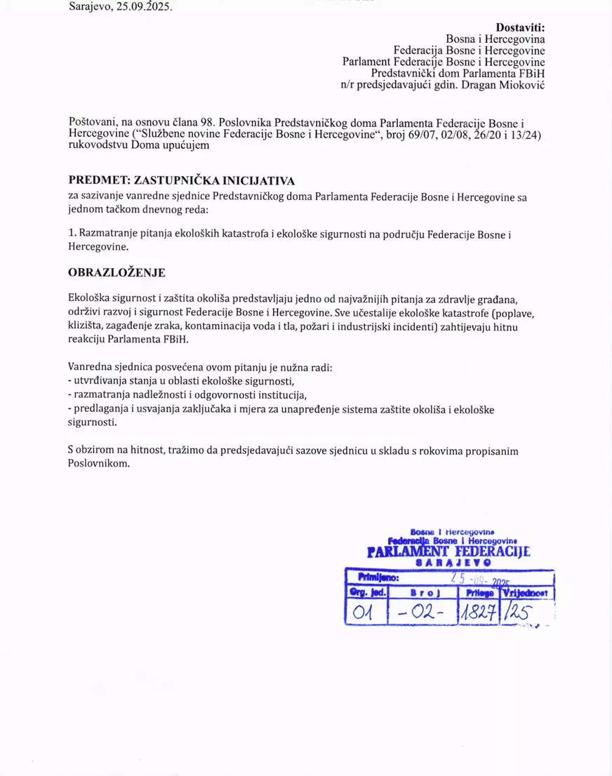 (Patria) - Grupa federalnih zastupnika zatražila je sazivanje vanredne sjednice Zastupničkog doma Parlamenta FBiH s jednom tačkom dnevnog reda - Razmatranje pitanja ekoloških katastrofa i ekološke sigurnosti na području FBiH.