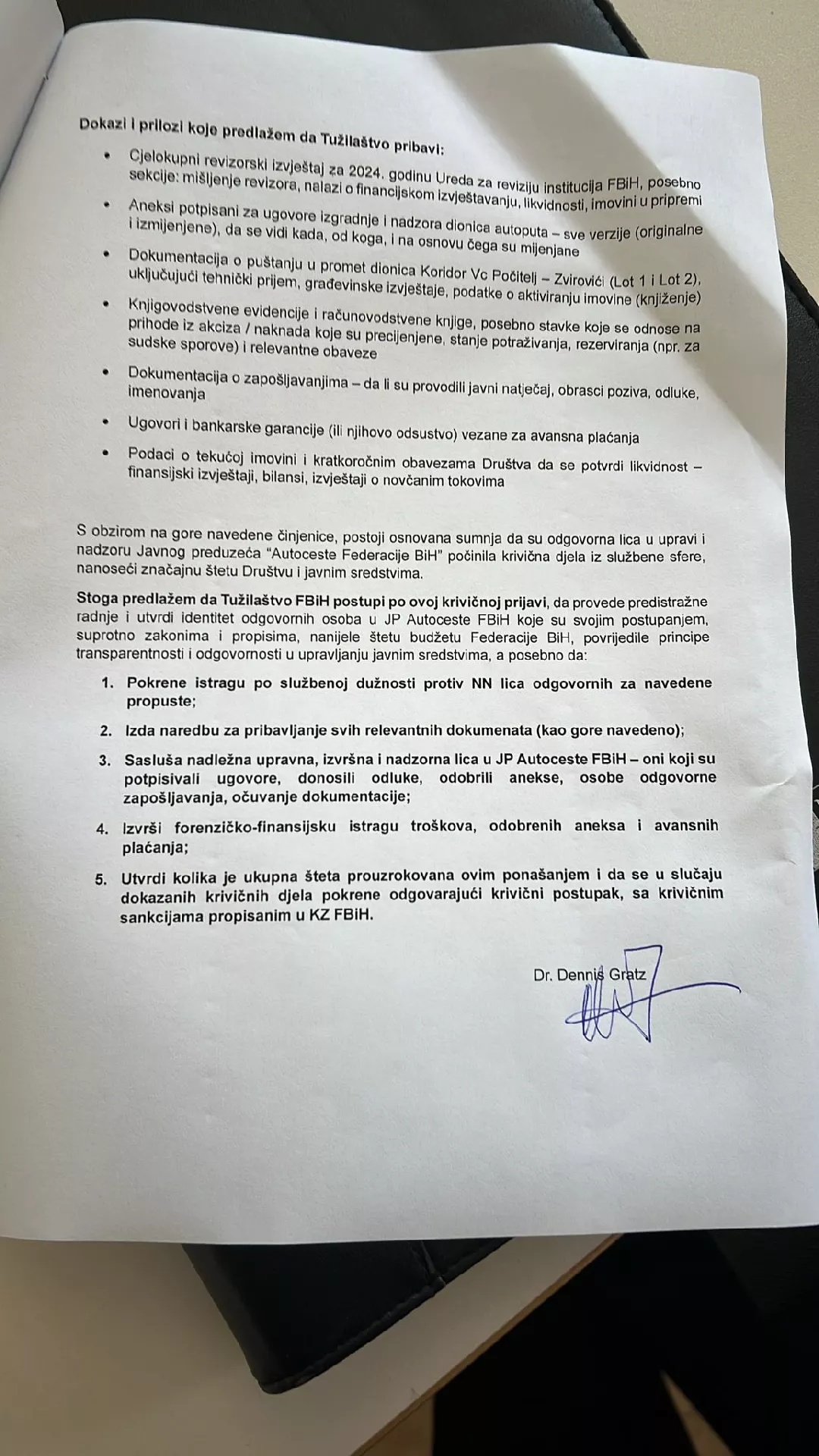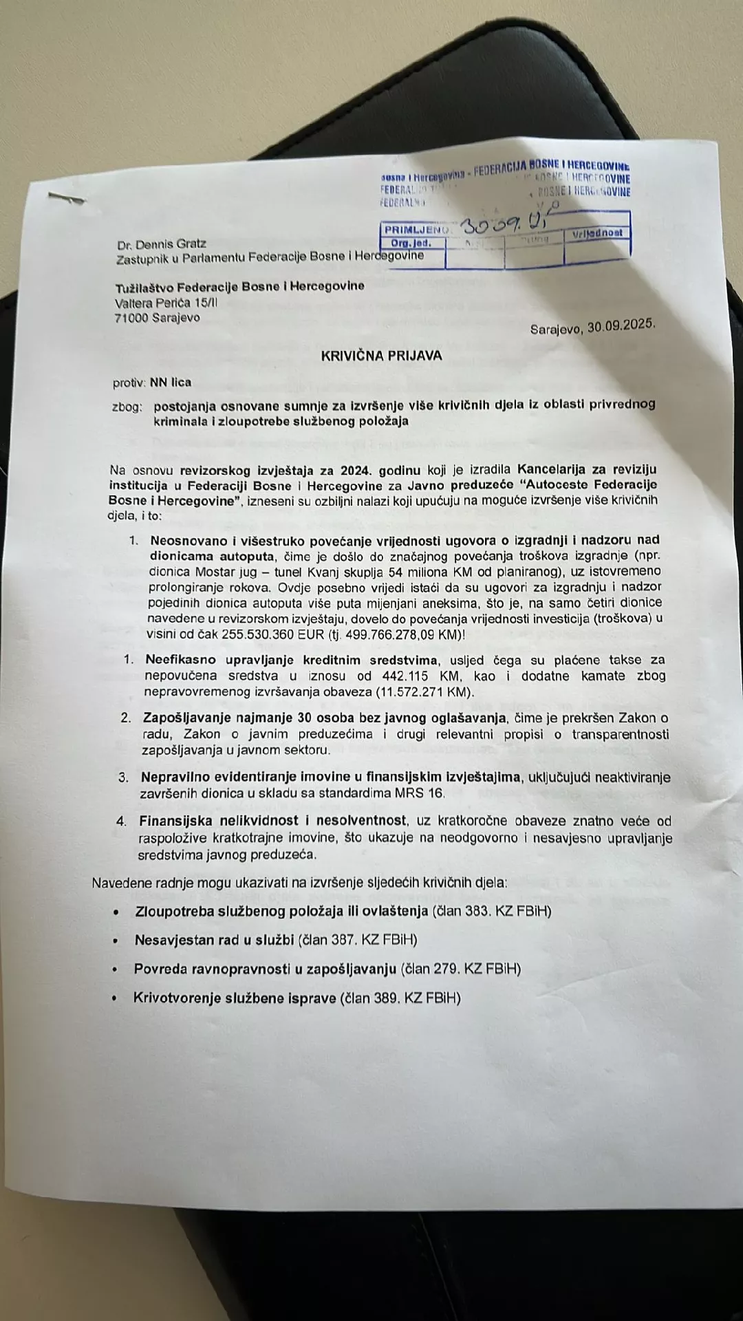 (Patria) - Zastupnik u Predstavničkom domu Parlamenta FBiH Dennis Gratz (DF) podnio je Federalnom tužilaštvu krivičnu prijavu protiv NN lica zbog postojanja osnovane sumnje za počinjenje više krivičnih djela iz oblasti privrednog kriminala i zloupotrebe službenog položaja u JP Autoceste FBiH.