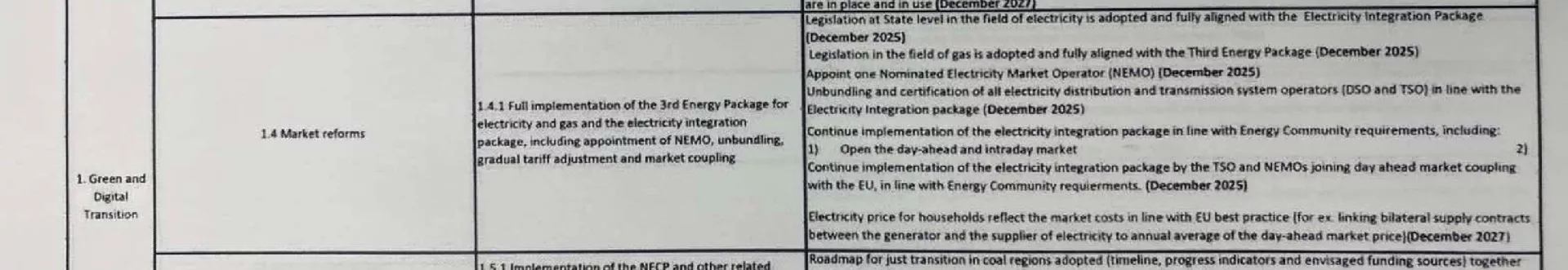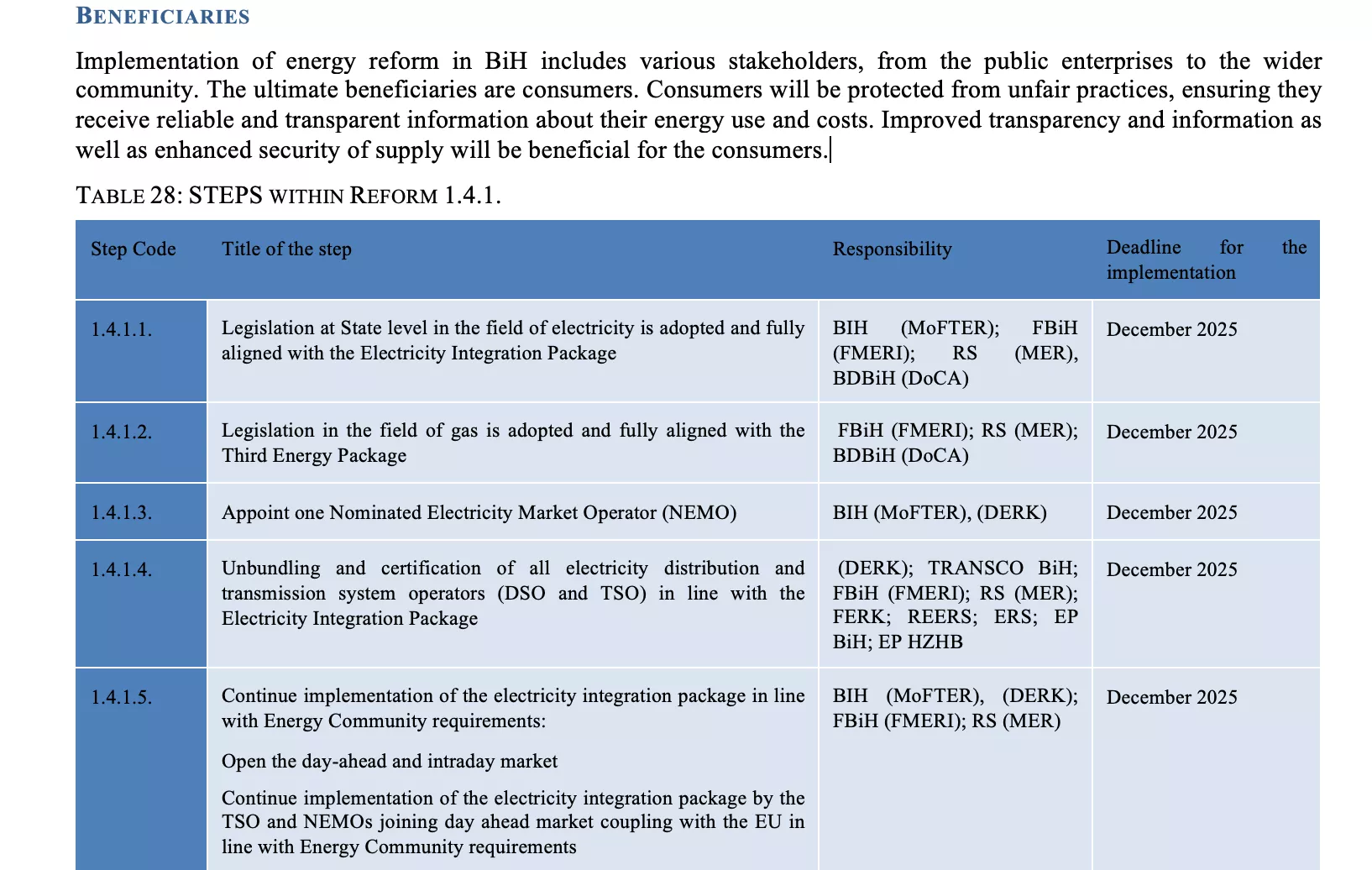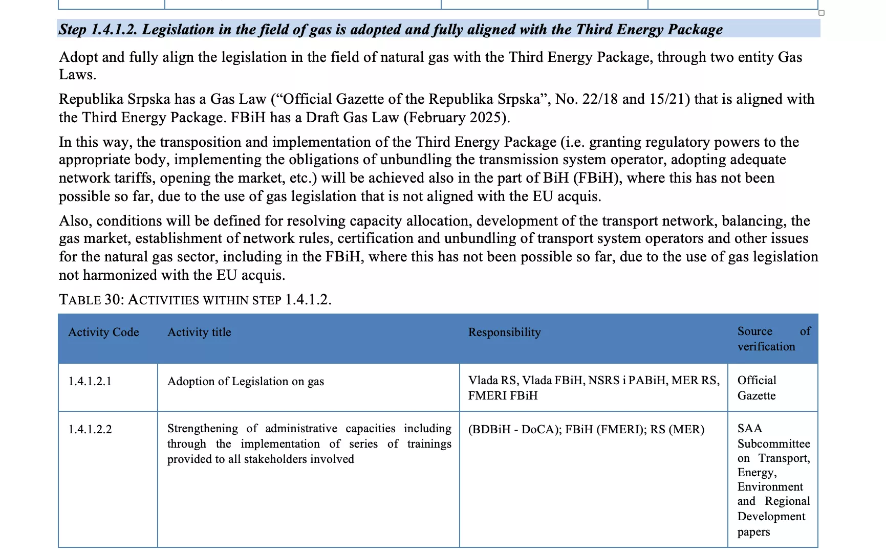 "Usvojiti i u potpunosti uskladiti zakonodavstvo u području prirodnog plina s Trećim energetskim paketom, putem dva entitetska zakona o plinu. Republika srpska ima Zakon o plinu ("Službeni glasnik Republike srpske", br. 22/18 i 15/21) koji je usklađen s Trećim energetskim paketom. Federacija BiH ima Nacrt zakona o plinu (februar 2025.).