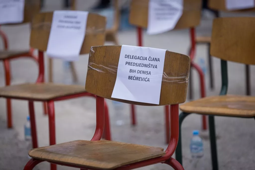 Redovi praznih stolica s natpisima rezervisanim za institucije i političke predstavnike stoje kao nijemi simbol odsutnosti onih koji su trebali biti uz narod.