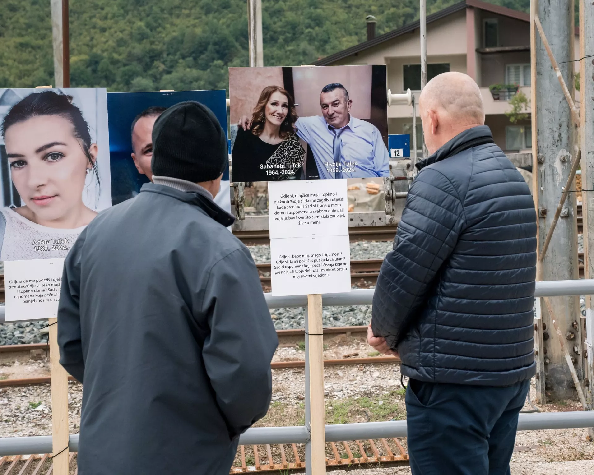 Na mjestu današnjeg komemorativnog okupljanja postavljene su fotografije stradalih, kao i simbolične poruke ispred željezničke pruge koja je bila neposredna pozadina nesreće.