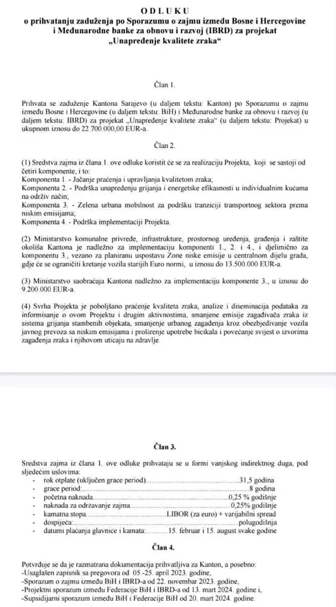 (Patria) - Vlada Kantona Sarajevo (KS) donijela je Odluku o prihvatanju zaduženja po Sporazumu o zajmu između BiH i Međunarodne banke za obnovu i razvoj (IBRD) za projekat "Unapređenje kvaliteta zraka" u ukupnom iznosu od 22,7 miliona eura.