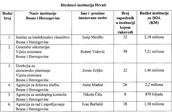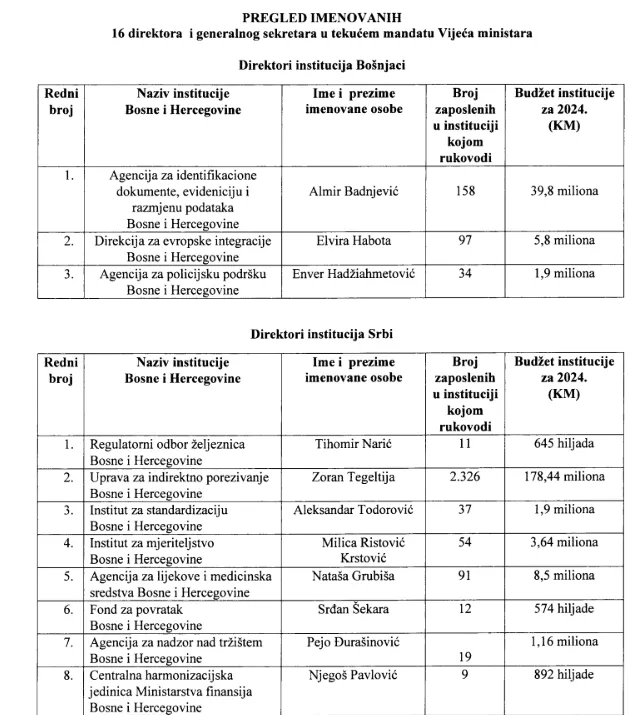 On je dostavio i tabele imenovanih rukovodilaca u 16 državnih institucija u aktuelnom mandatu Vijeća ministara BiH.